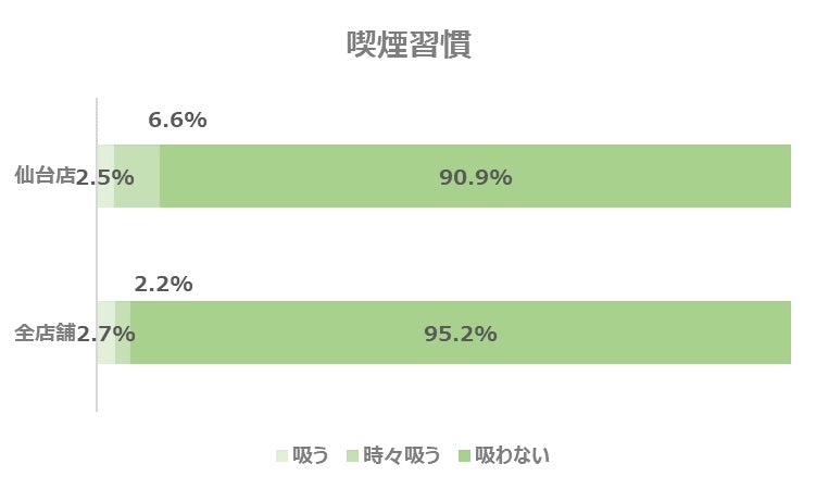 ただし、パートナーエージェント全体の会員様と比較すると、仙台店は喫煙している方の割合がやや高い傾向にあります。