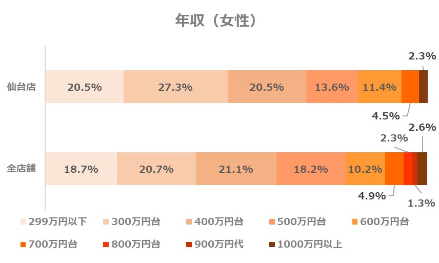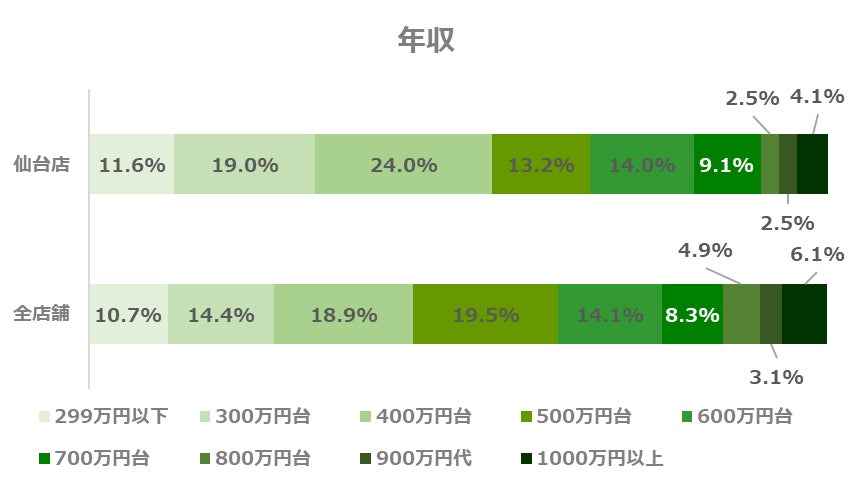 仙台店では、全店舗と比較して年収400万円台の方の割合が高く、ついで300万円台の方が多い結果となっています。