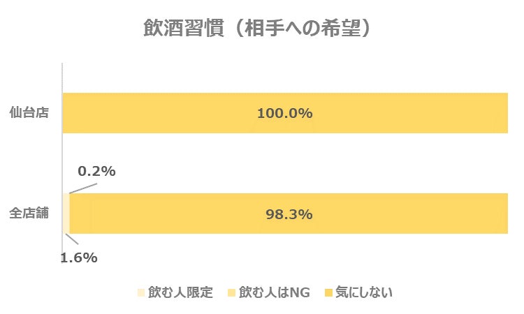 こちらもお相手に求める飲酒の習慣についてのデータを見てみると、仙台店の会員様全員が「気にしない」という結果になりました。