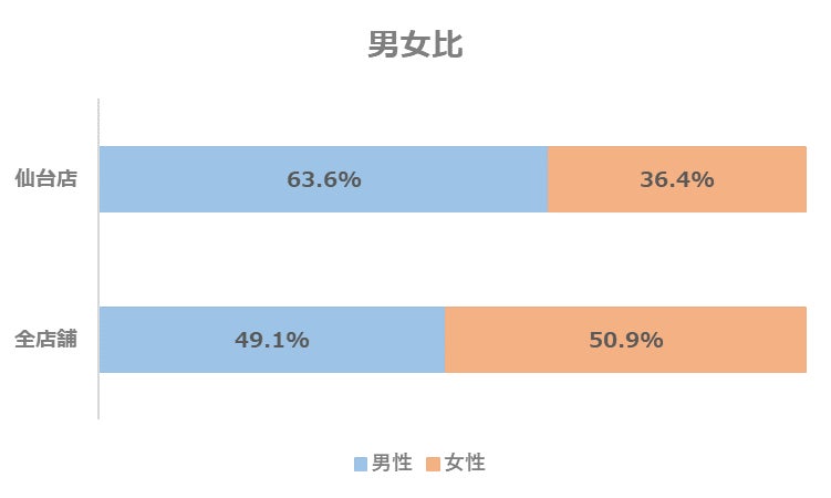 仙台店の年代別構成比は、全店舗と比べて30代の割合がやや高い傾向にあります。