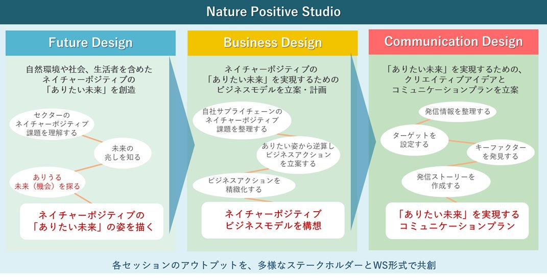 「①Future Design」「②Business Design」「③Communication Design」の3つのアプローチから、ネイチャーポジティブとビジネス機会創出の両立を目指します。