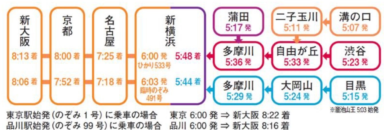 ① 早朝時間帯の東急線から東海道新幹線への新横浜駅での乗り換え