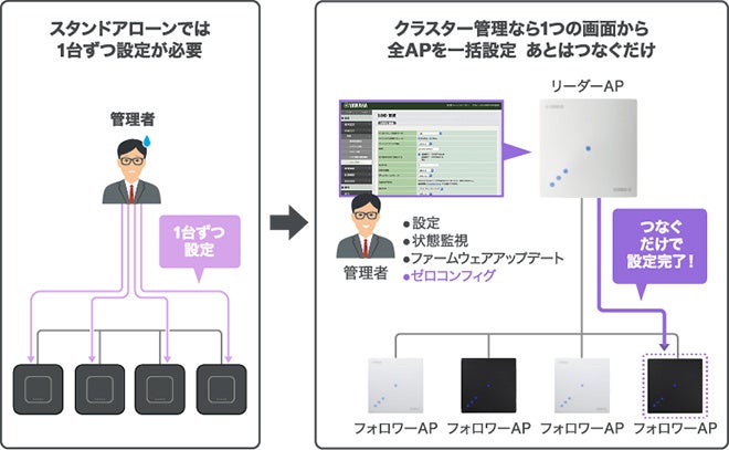加えて、両モデルとも、独自のクラウド型ネットワーク統合管理サービス「Yamaha Network Organizer(YNO)」にも対応し、複数拠点の無線LANの一括管理も行えます。また、本体内蔵コントローラーによるオンプレミス型の管理「クラスター管理機能」にも対応し、機器の交換や追加の際も、LANに接続して電源を入れるだけで設定が完了するため、無線LANの運用管理が容易に行えます。