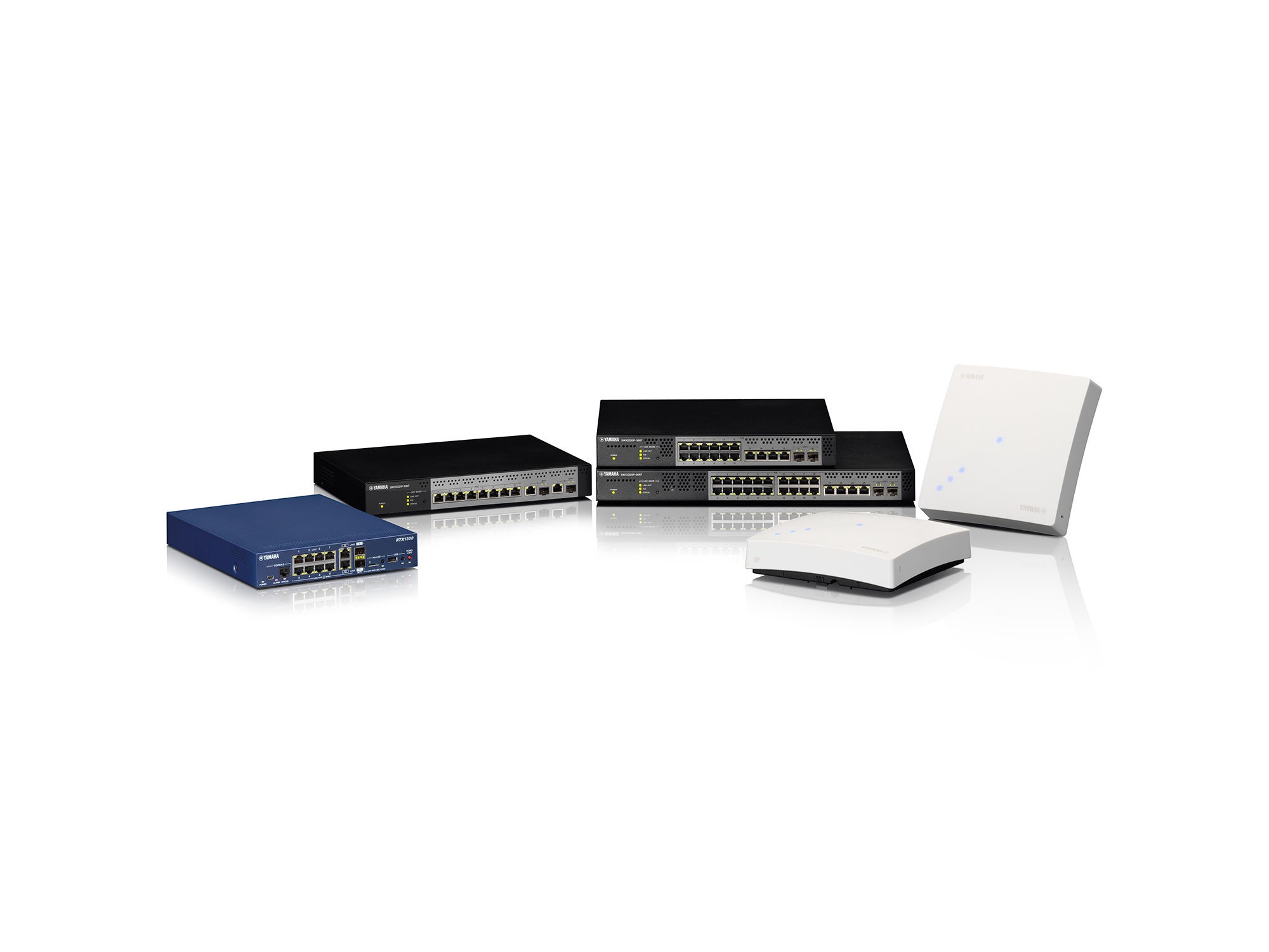 10ギガアクセスVPNルーター「RTX1300」は、ヤマハルーターとして初めて10ギガビット対応ポートを2個搭載し、LAN側およびWAN側両方の高速化を実現します。また、「LANマップ」機能を搭載し、LAN内のネットワーク構成を分かりやすく表示することで、ネットワーク管理者の管理、運用の負担を軽減します。スマートL2 PoEスイッチ「SWX222xPシリーズ」は、2.5ギガビットかつPoE+に対応したポートを8/16/24個搭載しているため、複数台の『WLX322』『WLX323』の性能を最大限活かせることができます。さらに、アップリンクポートとして10ギガビット対応のポートを利用することで、複数の2.5ギガビット通信をボトルネックなく上位のネットワーク機器へ転送します。スタンダードL3スイッチ「SWX3220シリーズ」は、10ギガビットまたはSFP+スロットに対応しており、複数のフロアスイッチ/ディストリビューションスイッチをコアスイッチとして収容することができます。