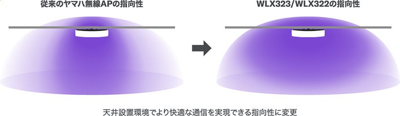 『WLX322』『WLX323』は、天井設置環境において適したアンテナの指向性に対応することで、広いエリアで強い電波を提供します。これまでのモデルで天井設置した際に、強い電波が届きにくかった場所にも届くようになり、快適な通信を実現します。