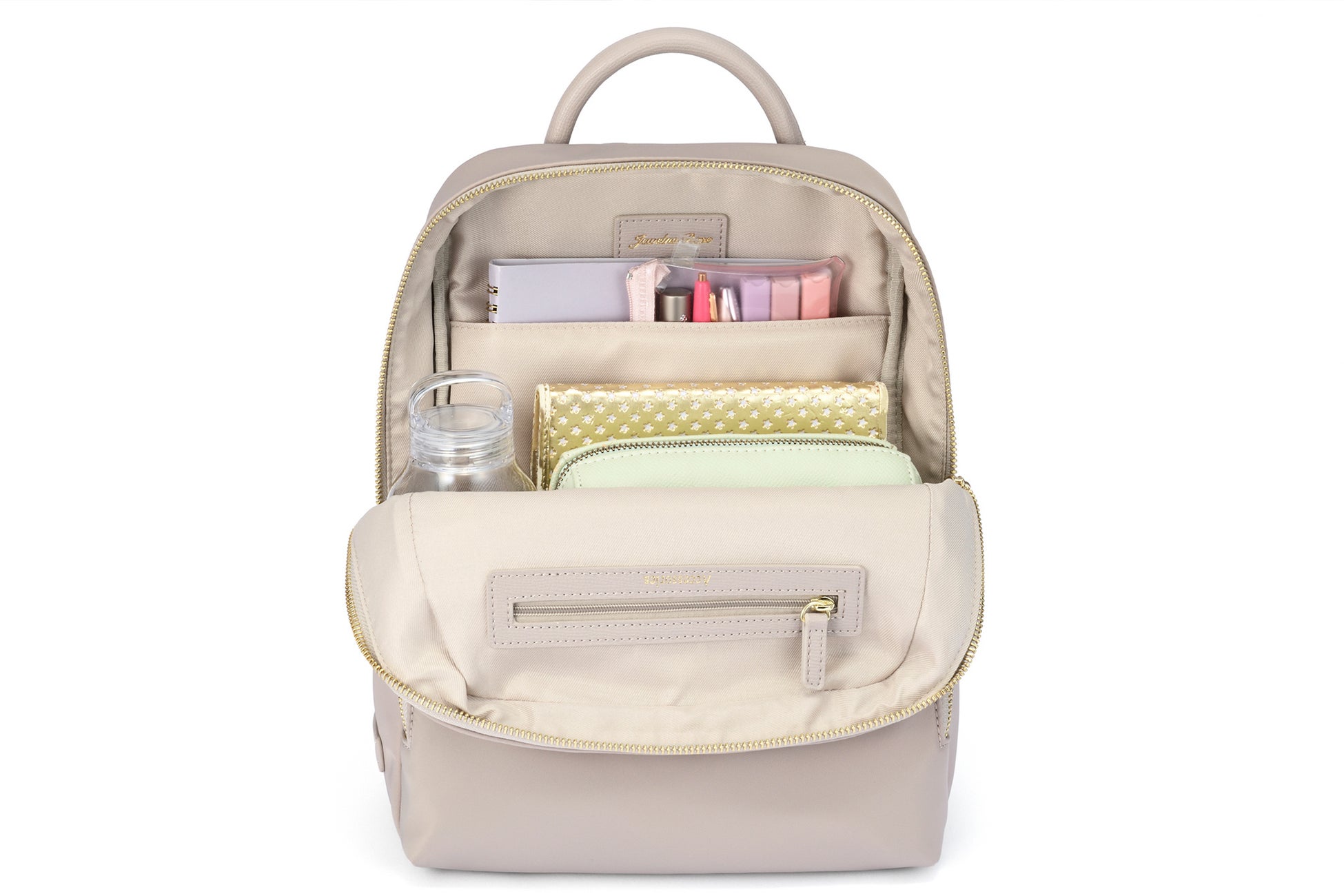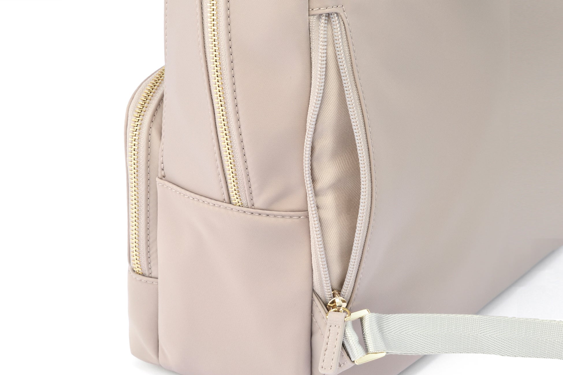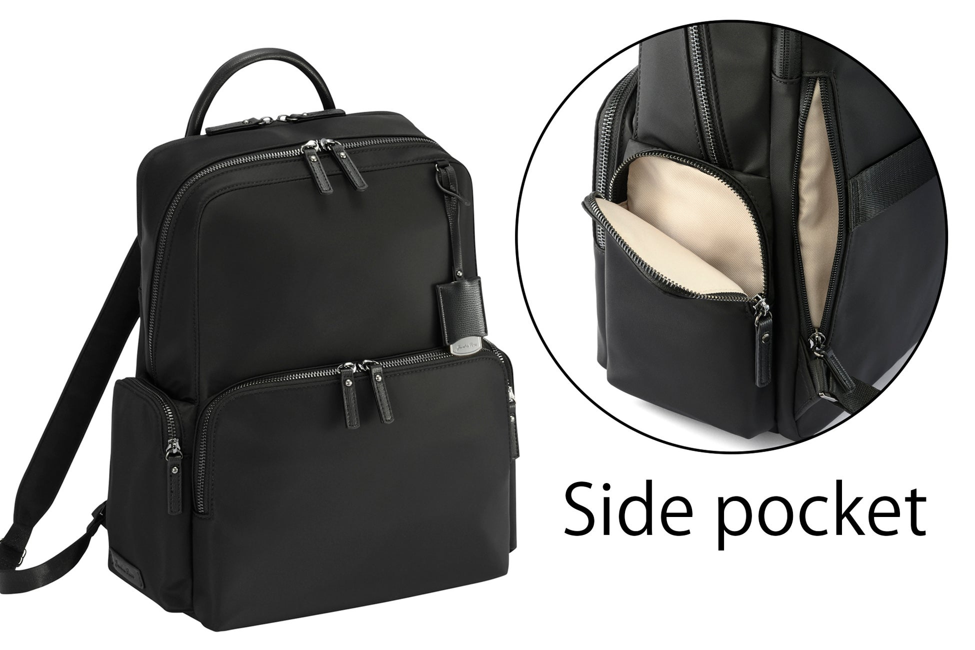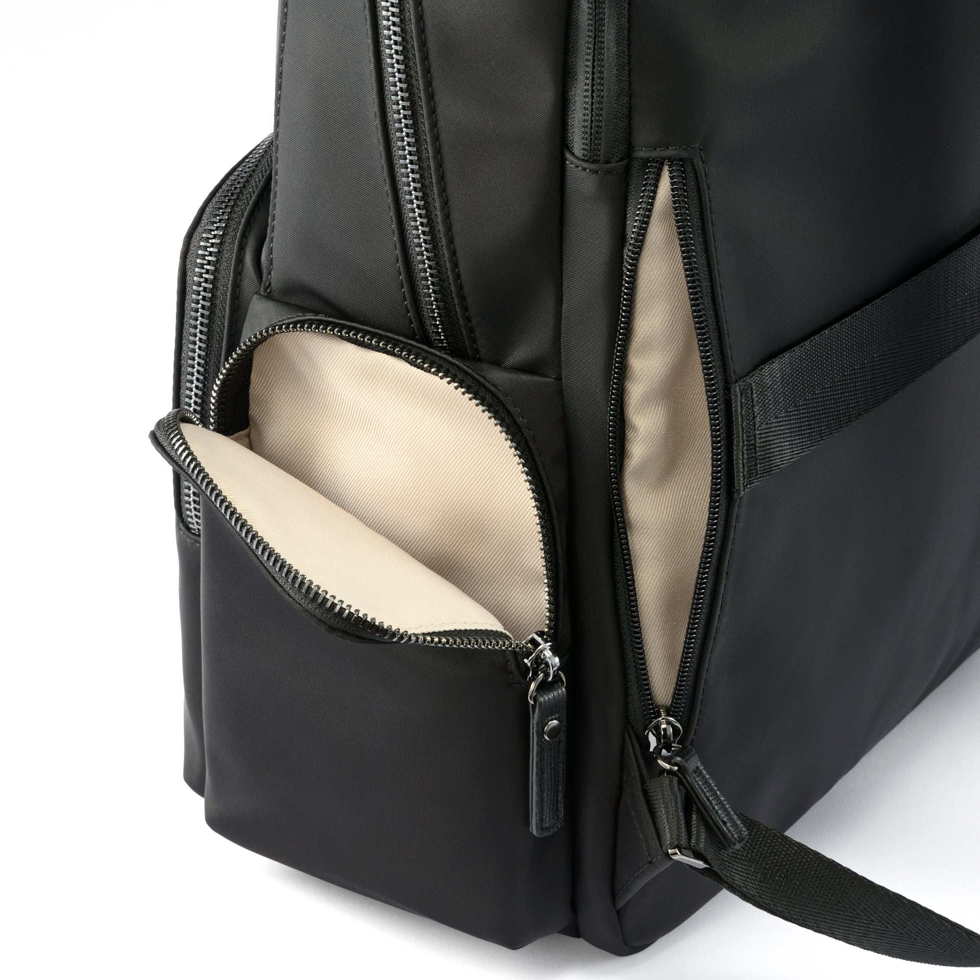 リップやカードケース、小物ポーチなどをスムーズに収納できるよう、リュック側面にファスナー付きポケットを配置しました。