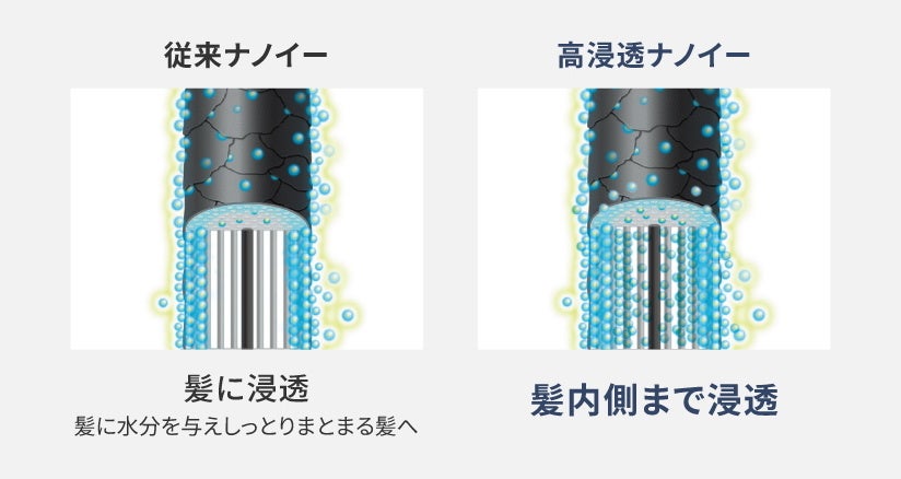 これにより、乾かすだけで、髪の内側まで水分補給をすることが可能に。「高浸透ナノイー」が髪に浸透し、髪の水分バランスを整えます。また、キューティクルを引き締め、しっとりまとまる髪へ導きます。