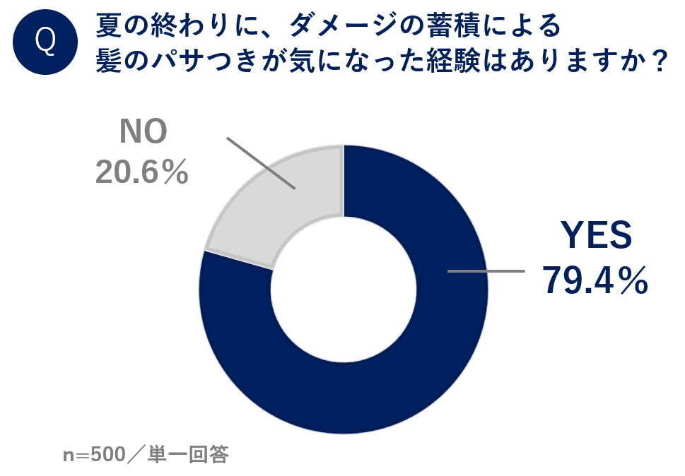 また、「夏の終わりに、ダメージの蓄積による髪のパサつきが気になった経験はありますか?」と聞いた質問でも、79.4%が「ある」と回答。多くの人が、夏のダメージにより「夏枯れ髪」と言える状態を実際に経験しているようです。