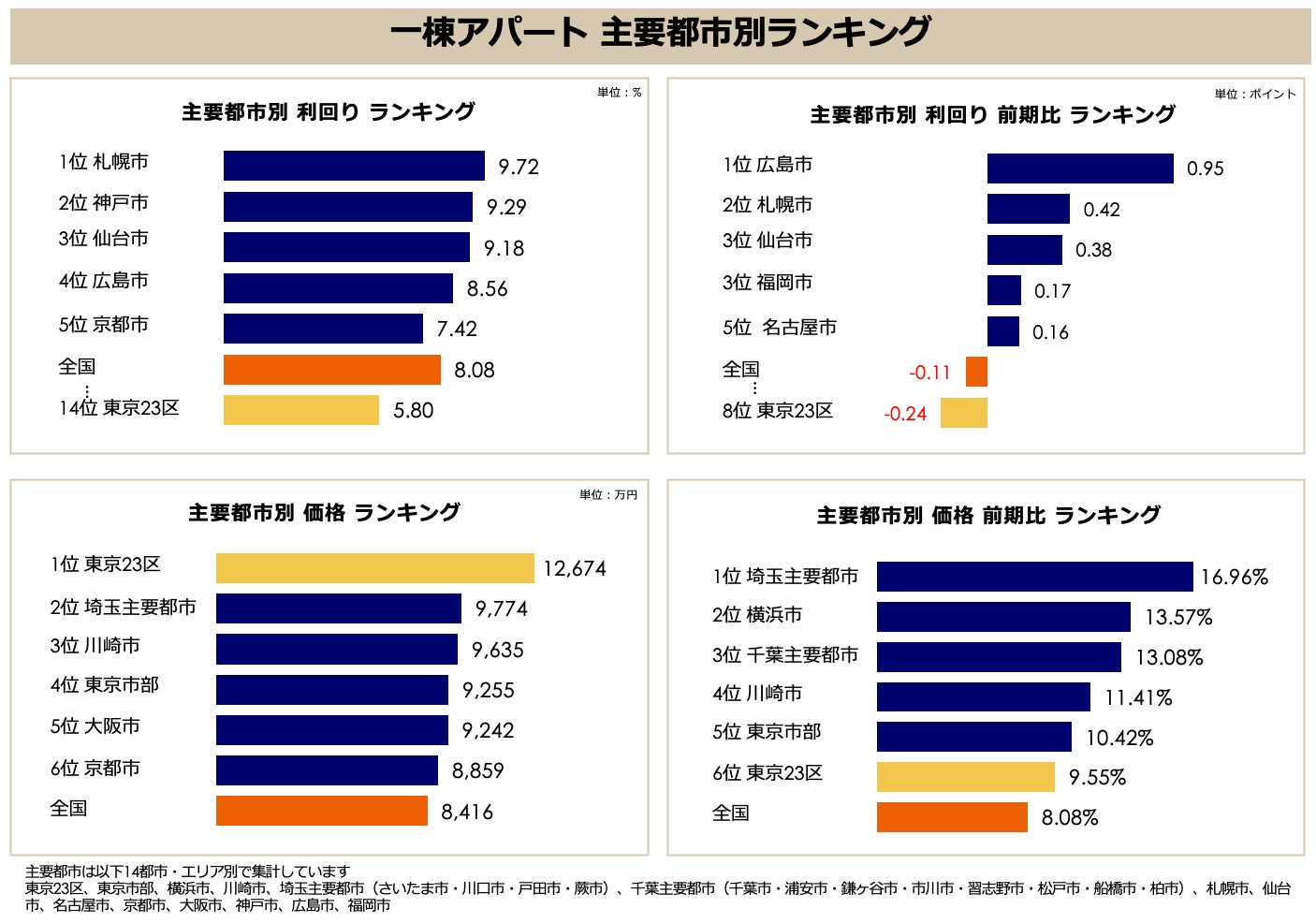 一都三県・主要都市別では、東京23区の平均価格が3,337万円で首位となり、次いで東京市部(2,264万円)、川崎市(2,145万円)と首都圏エリアが上位を占めました。特筆すべきは広島市で、価格が前年比+93.39%(2,106万円)と急騰しています。また、名古屋市では利回りが前年比で0.62ポイント低下(6.82%)しており、全国平均(6.66%)に迫る水準まで低下しました。