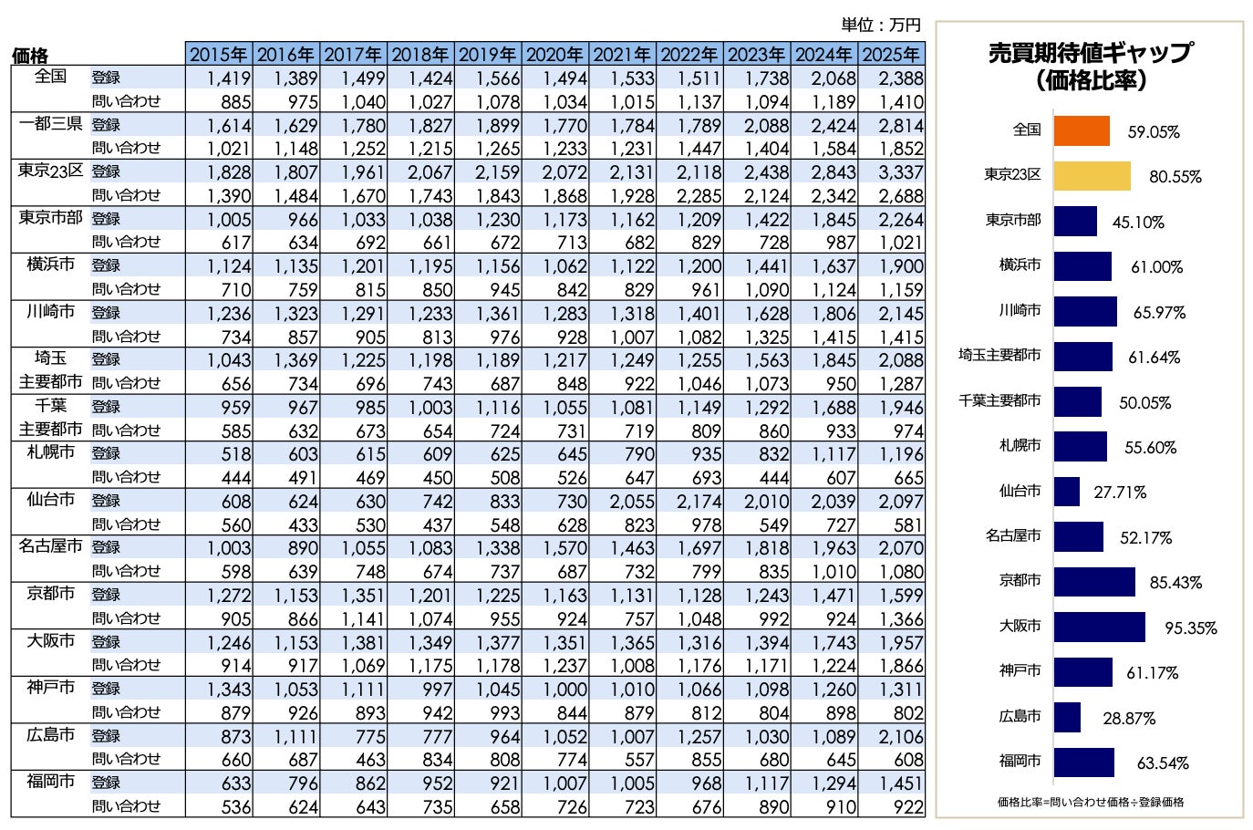 こうした市場環境下における登録価格・利回りと問い合せ価格・利回りのギャップ(売買期待値ギャップ)に着目すると、都市ごとの売買期待値ギャップには大きな違いが見られます。東京23区は利回り差(登録利回りと問い合わせ利回りの差)が0.68ポイントと主要都市の中で最も小さく、一見すると登録と問い合わせのバランスが均衡しているように見えますが、価格比率(登録価格に対する問い合わせ価格の割合)で見ると80.55%となっており、登録価格に対して約2割低い価格帯で問い合わせが入っていることが分かります。一方、大阪市は価格比率が95.4%と、登録価格と問い合わせ価格の比率が5%未満に留まっており、全国主要都市の中で売買期待値ギャップの小さいエリアと言えます。対照的に地方都市では売買期待値ギャップが拡大しており、札幌市は利回り差が3.04ポイントと大きく、価格比率は55.6%と問い合わせ価格は登録価格の約半値程度の水準です。さらに仙台市では利回り差は2.40ポイントですが、価格比率は27.7%と著しく低く、登録平均(2,097万円)に対し問い合わせ平均(581万円)と、検討されている価格帯自体に大きな開きがあり、売買期待値のギャップが顕著となっています。