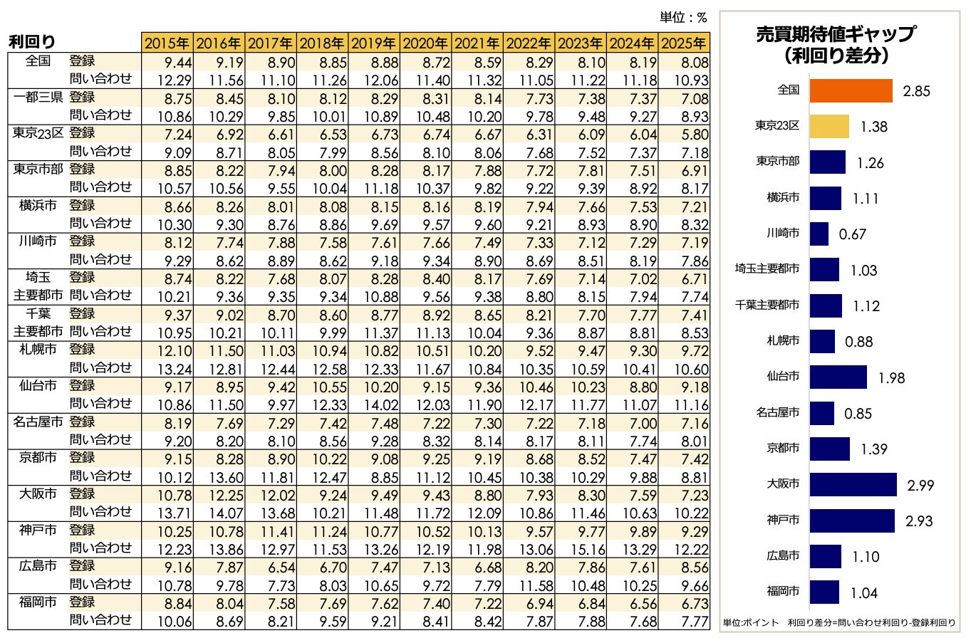 利回りについては、仙台市(8.63%)、札幌市(8.20%)、神戸市(7.88%)などが8%前後〜後半の水準を示しており、価格上昇が続く中でも地方都市では比較的高い収益性が確保されています。