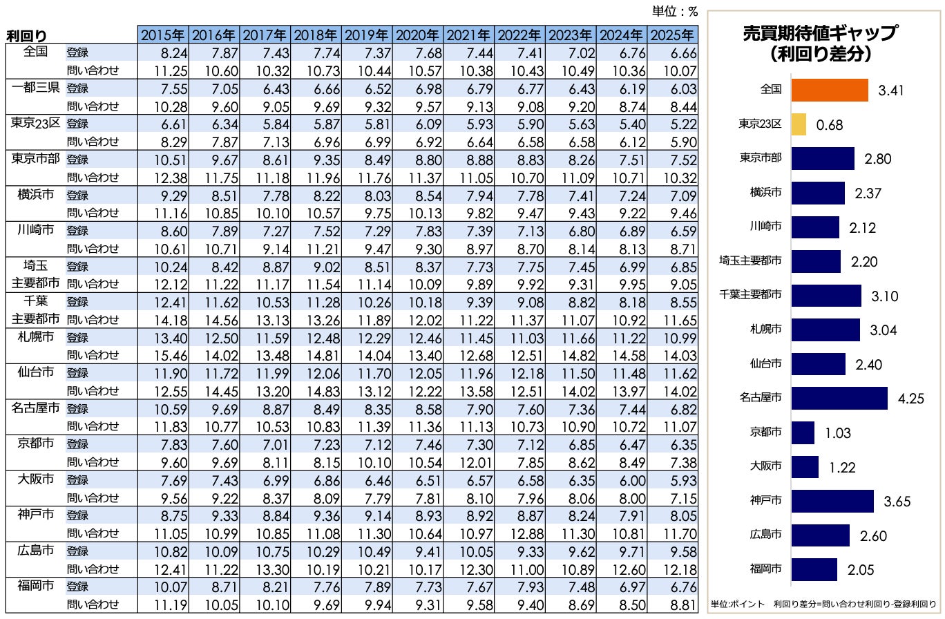 地域別の動向を見ると、首都圏の平均価格は9,239万円(前年比+10.91%)、関西圏は7,737万円(同+4.03%)と、都市圏が価格上昇を牽引しています。一方で、北海道、東北、東海などの地方圏では価格が前年から下落または横ばいとなっており、都市圏への一極集中傾向が見られます。利回りに関しては、信州・北陸(13.93%)、東北(12.70%)、北海道(12.38%)など、地方圏では10%を大きく超える高水準が継続しています。