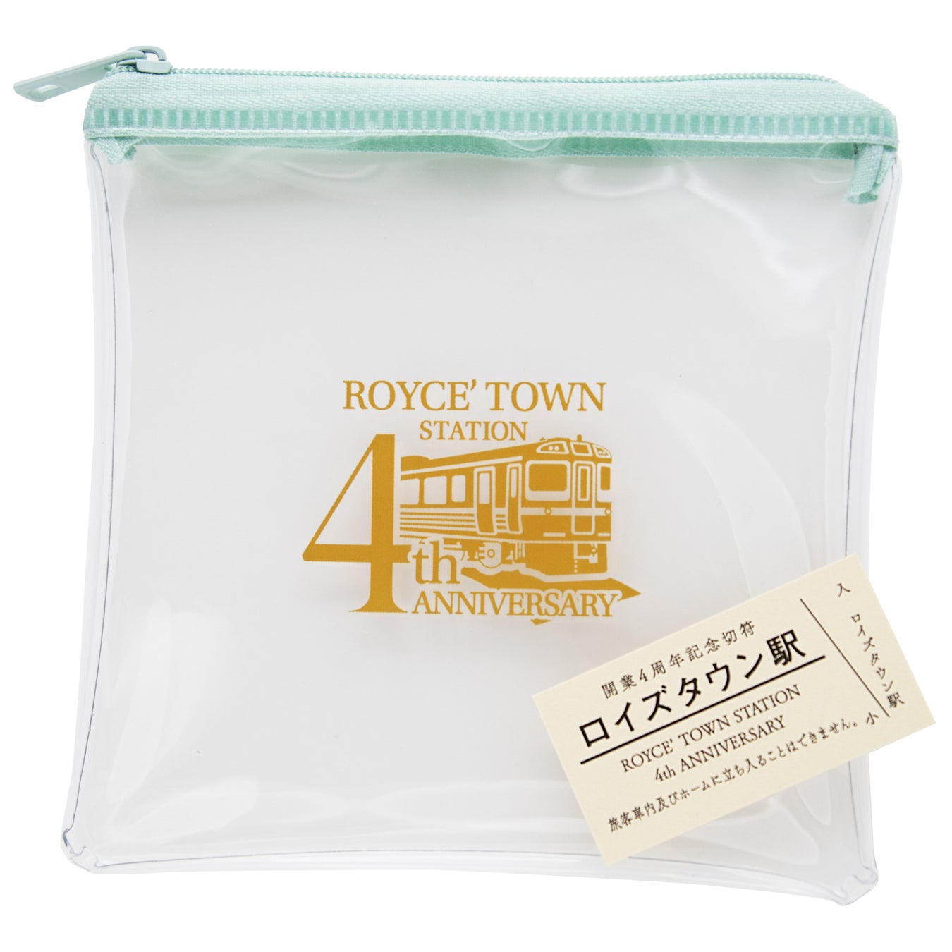 ロイズタウン駅4周年記念ロゴをデザインした、縦約13.5cm×横約13.5cmのクリアポーチです。