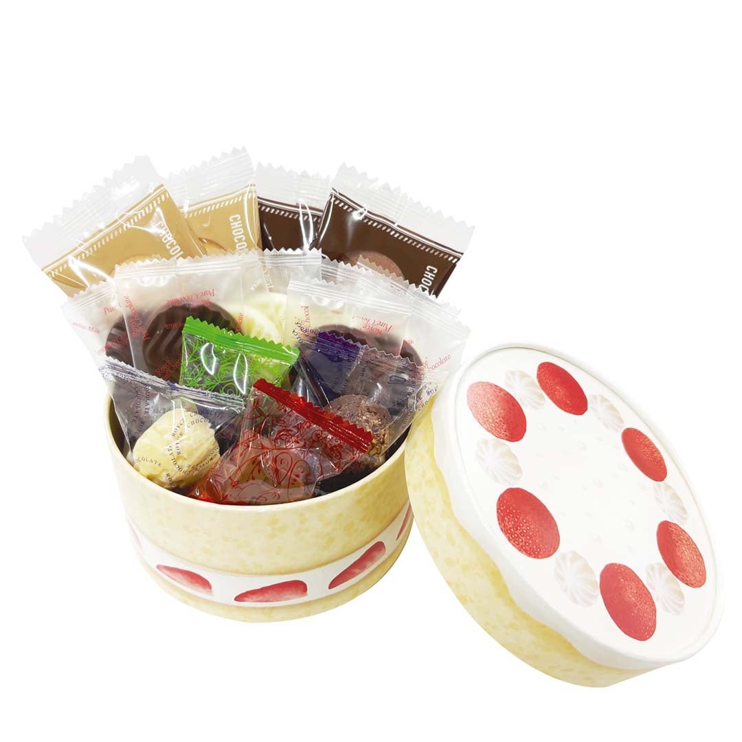 ケーキのデザインの直径約12㎝×深さ約6㎝の箱にチョコレートを詰めてお持ち帰りいただけます。