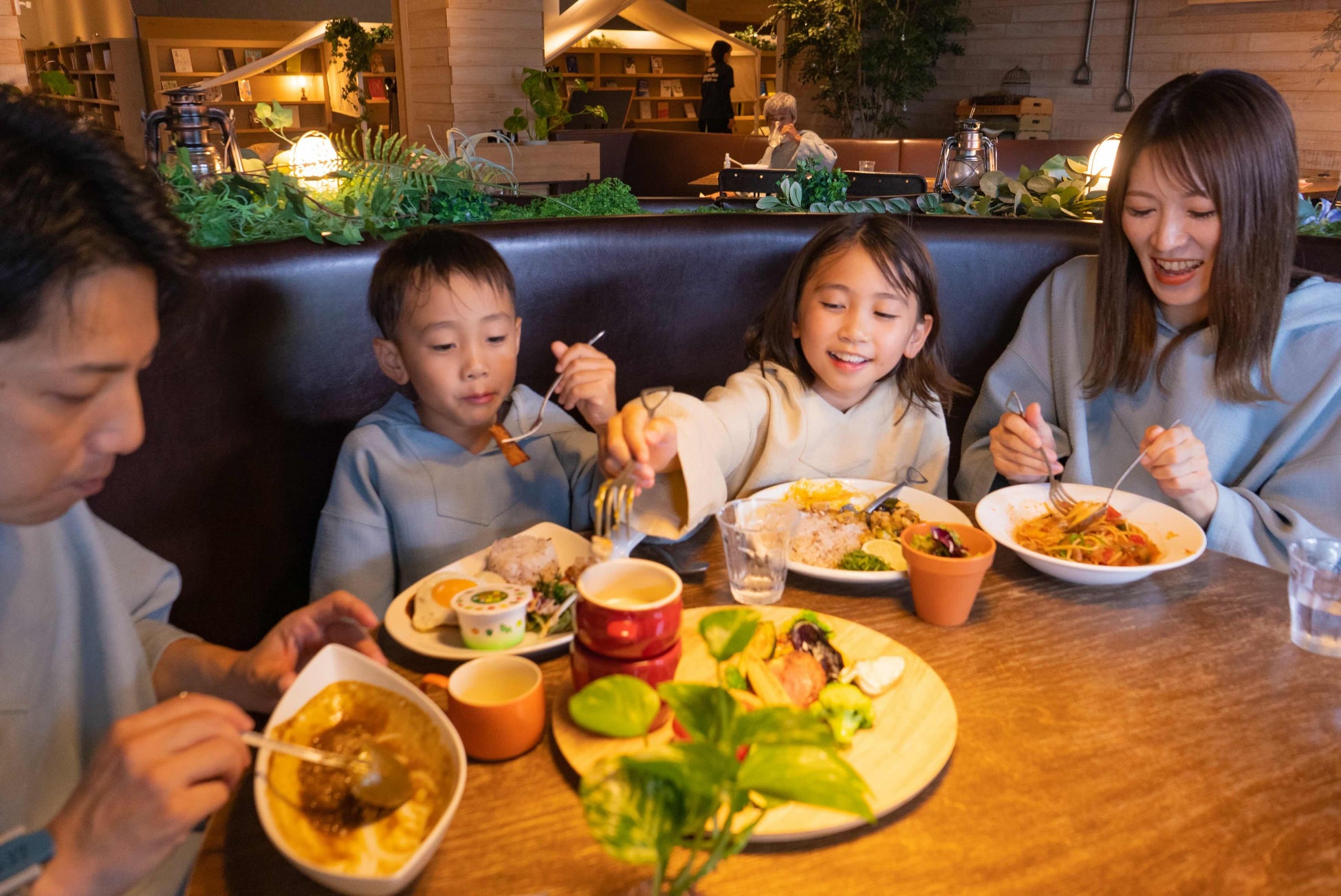 コンセプトは「カラダと心が晴れる庭」。充実のおふろ・サウナ、採れたて野菜たっぷりのごはん、裸足で過ごせる緑豊かなラウンジでお庭にいるようにくつろぎ、心身共に晴れわたる1日をお過ごしいただけます。