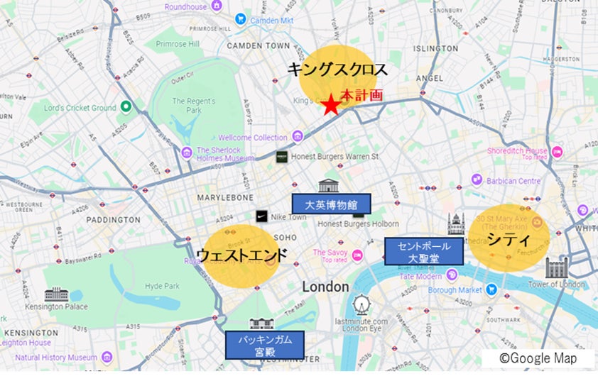 本事業の予定地は、ロンドン有数の立地に位置しており、ロンドンの主要鉄道駅でユーロスターの発着駅であるセントパンクラス駅、英国内の主要都市への発着駅であるキングスクロス駅、キングスクロスセントパンクラス駅、ユーストン駅といった総乗降客数が年間で2億人を超える4駅と近接します。また、現在計画中の新路線「Cross Rail 2」の新駅も新設される予定であり、将来的にエリア全体のさらなる発展が見込まれています。