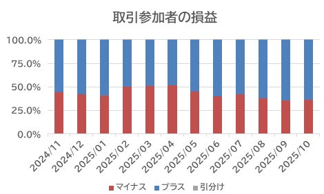 10月のFX取引において実現益を出した投資家の割合は63.9%と、9月の64.4%から0.5%ポイント減少した。直近3カ月は、回転を利かせながら、6割超の投資家が利益を積み上げている。