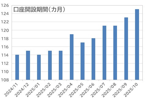 取引をしたFX投資家の口座開設後の期間は、平均125カ月(10年5カ月)と、前月から伸びた。