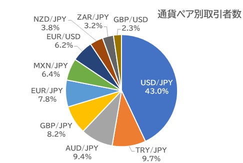通貨ペア別取引者数のトップ10は、USD/JPY(米ドル/円)・TRY/JPY(トルコリラ/円)・AUD/JPY(豪ドル/円)・GBP/JPY(ポンド/円)・EUR/JPY(ユーロ/円)・MXN/JPY(メキシコペソ/円)・EUR/USD(ユーロ/米ドル)・NZD/JPY(NZドル/円)・ZAR/JPY(南アフリカランド/円)・GBP/USD(ポンド/米ドル)の順。上位の5通貨ペアの入れ替わりはなかった。