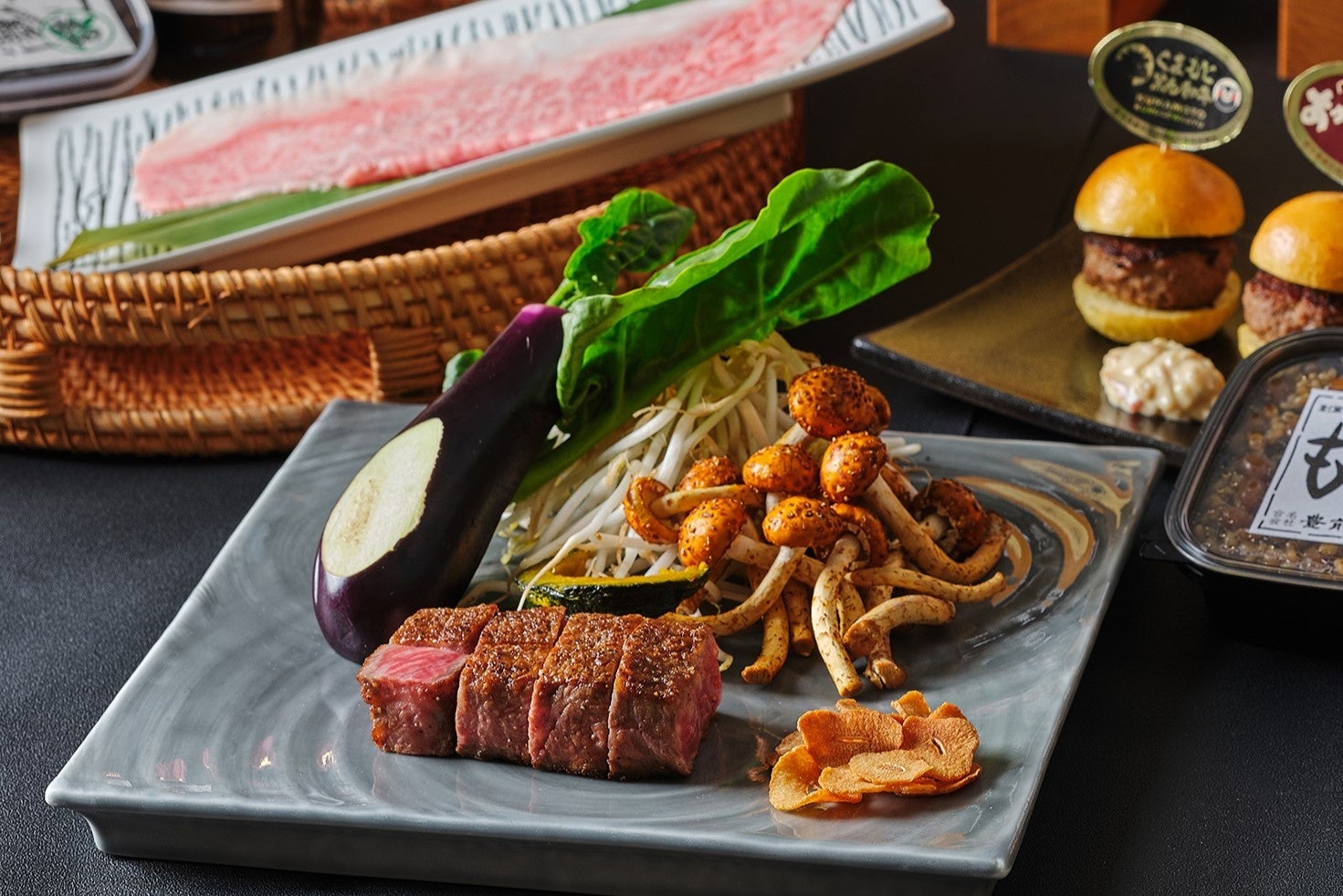 前菜は、エシカルなくまもとあか牛とくまもと黒毛和牛のハンバーガーの食べ比べを、高森町産の阿蘇もろみを使った風味豊かなタルタルソースとともに、お楽しみいただけます。メインディッシュには、くまもとあか牛のロースステーキと、馬刺醤油と山椒味噌で味わう焼きしゃぶしゃぶの2種を、無農薬で育てられた新鮮な熊本野菜とともにお届けいたします。