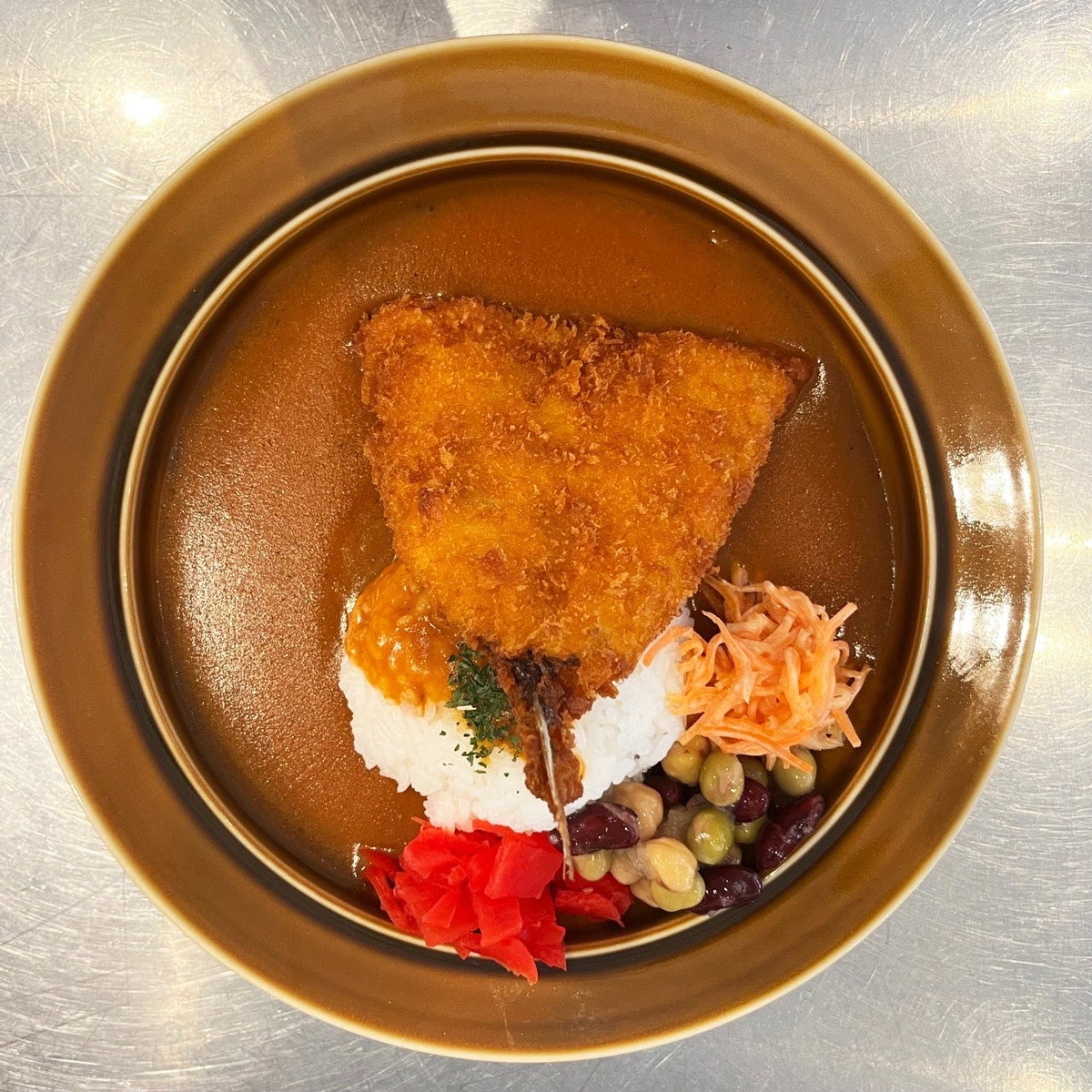 油が乗ったアジフライと人参のラペ、ミックスビーンズのサラダをトッピングしたカレーです。