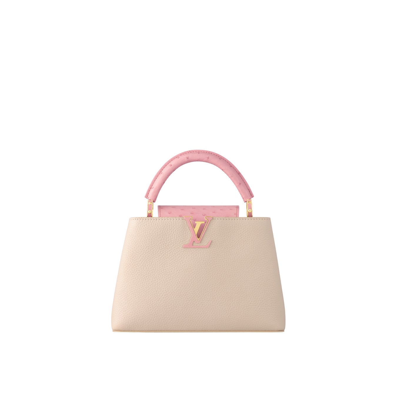 柔らかなベージュのラグジュアリーなトリヨンレザーで仕立てた「カプシーヌ BB」。フラップとエレガントなトップハンドルには、淡いピンクのオーストリッチレザーを使用しました。フラップは中に入れてLV シグネチャーを見せることも、外に出してシンプルなモノグラム・フラワー モチーフを見せることもできます。さまざまな持ち方をお楽しみいただける、幅広の取外し可能なストラップ付き。