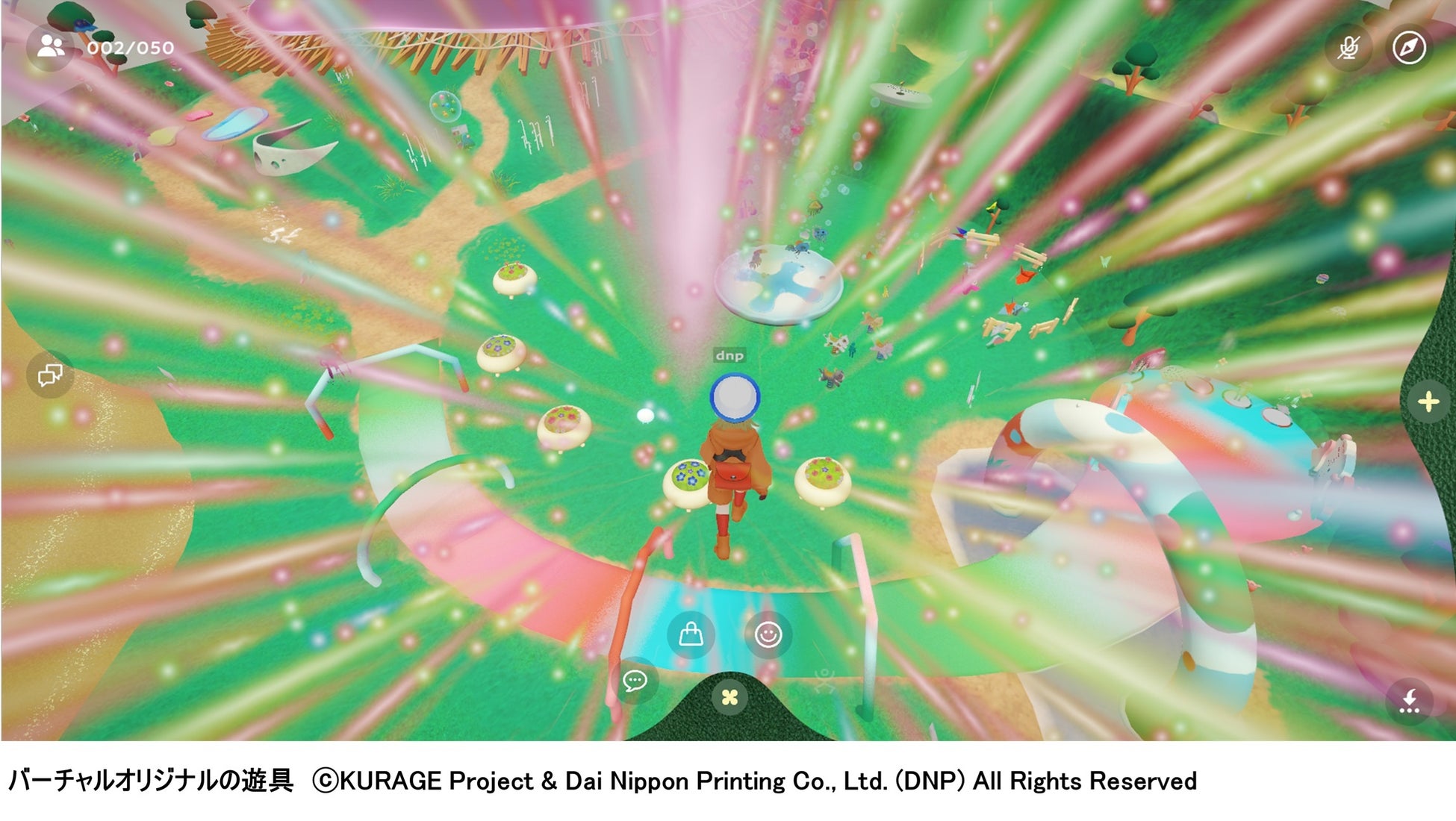 創造性を拡げる遊び場である「プレイマウンテン」には、「花火と共に天高く飛ぶ」体験ができる遊具や近づくとなぜか逃げてしまう遊具など、リアル空間では体験できない、バーチャル空間ならではの体験ができるオリジナル遊具を配置しています。