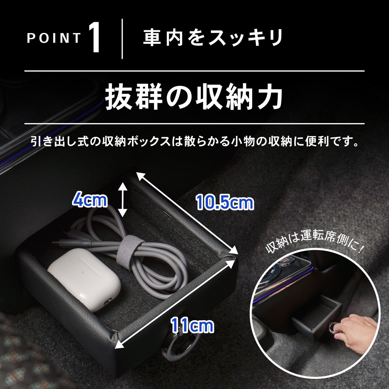 ハスラー MR52S MR92S専用 LEDコンソールボックス。タイプA、タイプCシガーソケットを完備。夜も安心のLED搭載。引き出し式収納BOXは散らかりを一瞬で解決。設置はフロアの中央に置くだけ。