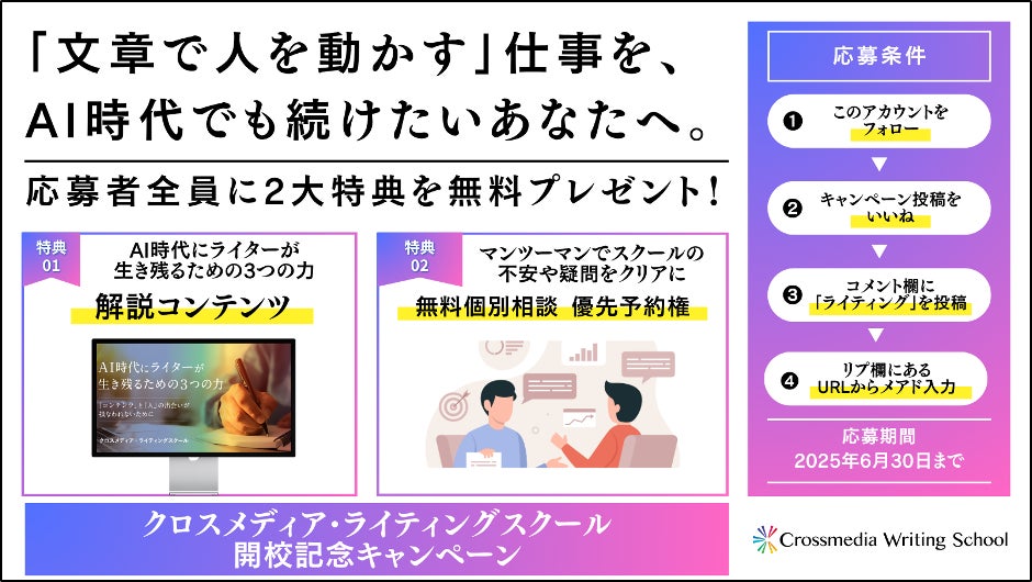 出版社直営「クロスメディア・ライティングスクール」開校記念!AI時代に活躍し続けるライターになるための限定特典を6月30日(月)まで無料プレゼント
