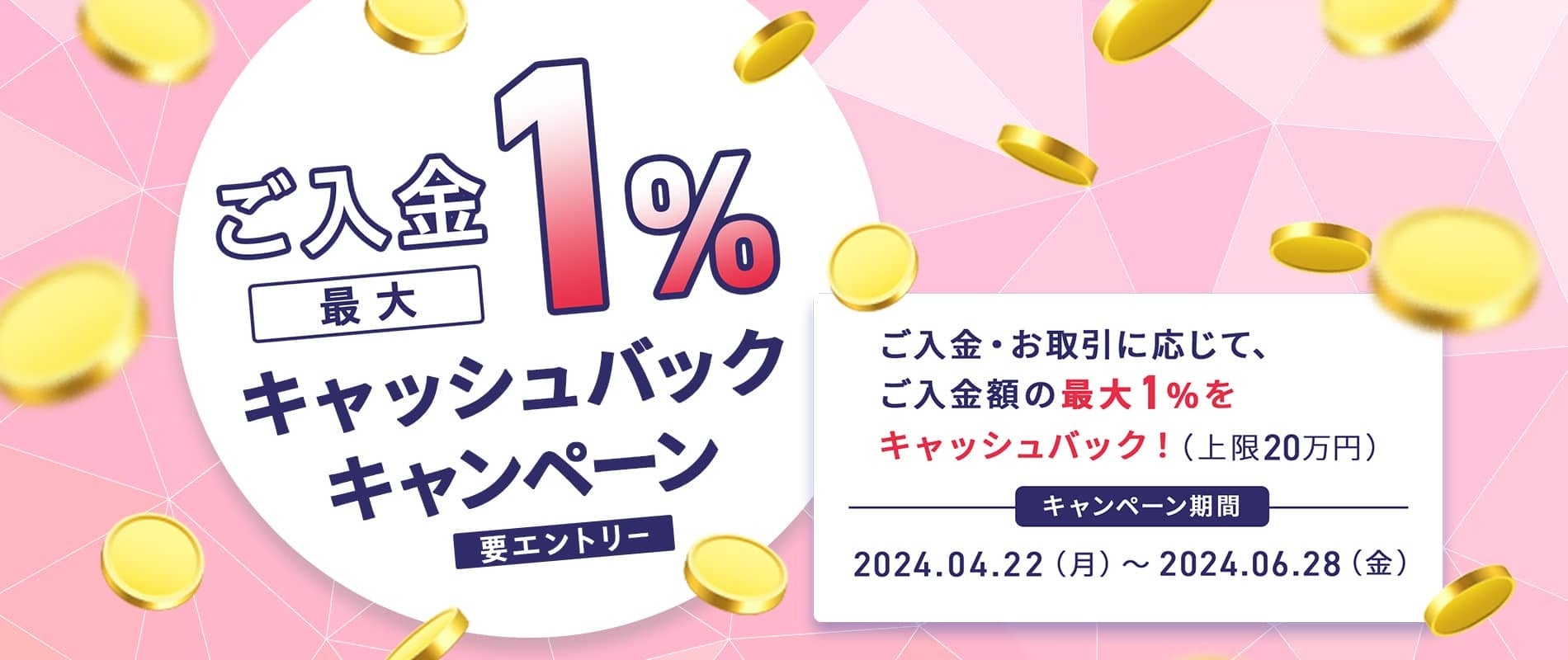 2024年4月22日(月)~2024年6月28日(金)の期間中、「ご入金で最大1%キャッシュバックキャンペーン」を開催いたします!