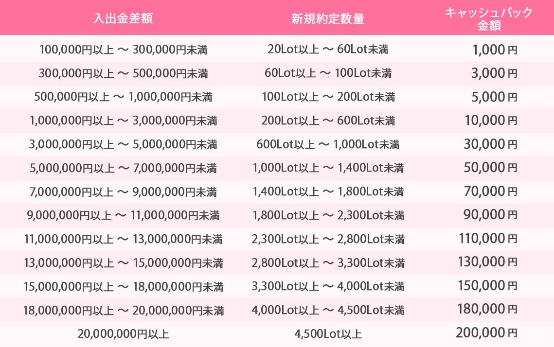 お客様の入出金差額、および「みんなのFX」「LIGHT FX」の新規約定数量に応じて、下表の通り入出金差額の最大1%をキャッシュバックいたします。(上限20万円)