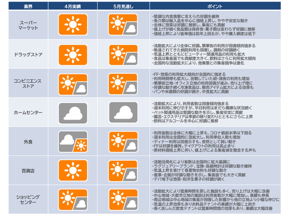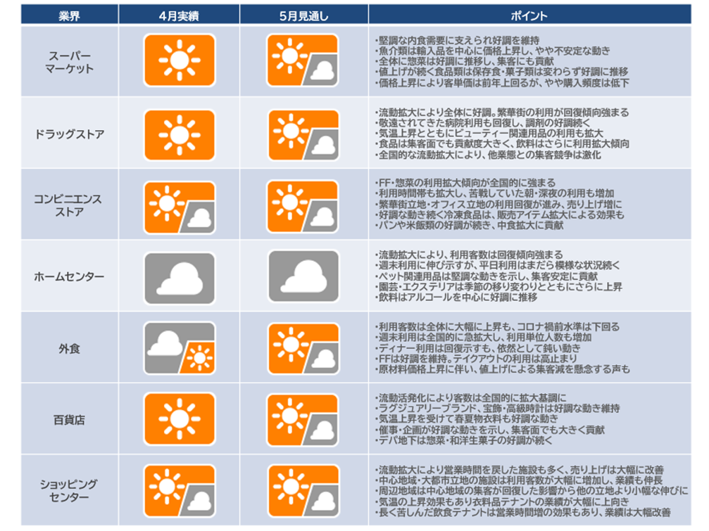 新型コロナ感染者数の減少傾向を受けて人流拡大が続いています。その効果でほぼすべてのリテイル・サービス業態で利用が拡大してきました。中でも長く不振が続いた外食は全国的に利用が拡大し、行列が出来る業態も散見されるようになっています。依然としてディナー利用はやや重い動きながら、全時間帯で利用拡大傾向にあり、多くの外食企業が朝食~ランチ時間帯の利用増に向けたメニュー強化、フェアによる集客力アップなど、反転攻勢の動きを強めているところです。