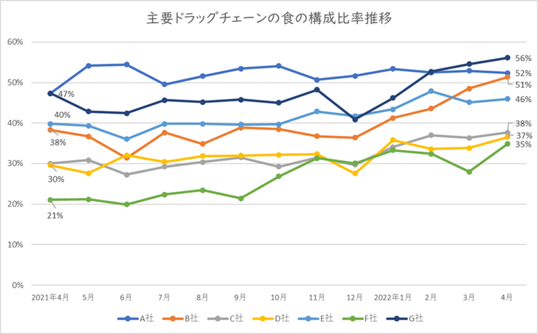 以下にレシーカ※で21年4月以降のドラッグストアチェーンの動きをみてみました。直近の数字と21年4月の数字を比較した際に5ポイント以上、食の構成比を上げた企業が7社ありましたが、そのうち5社は21年4月時点では食の構成比は40%以下にとどまっており、この1年で食ジャンルを着実に拡大してきたことが伺われます。ドラッグストア業界では食ジャンルは集客装置の一つとして、もはや不可欠な要素となってきており、コロナ禍による追い風を受けて、食ジャンルを拡張する動きはさらに加速する傾向にあります。食ジャンルの中では配送体制の課題からドラッグストア業態が苦手としてきた中食・惣菜ジャンルの取り扱いを開始・拡大する企業も出てきています。利用客数減で業績悪化していた都心部店舗では中食・惣菜ジャンルは利用機会を引き出す上での効果もあり、今後の動きは要注目です。