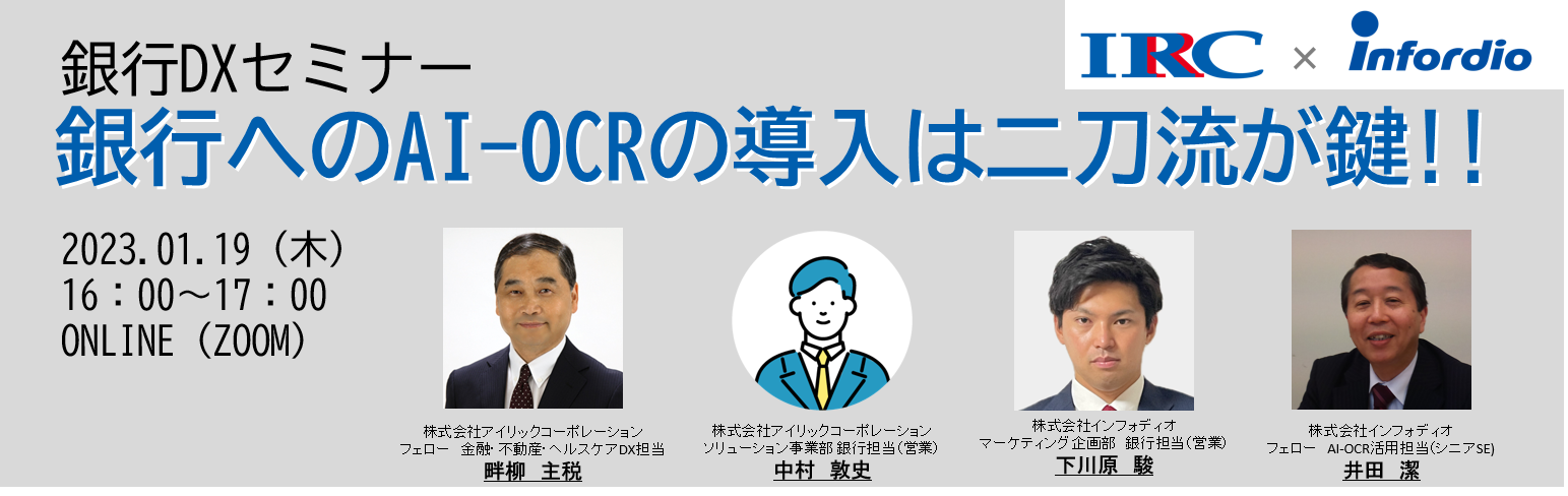 | 登壇者 | ・株式会社アイリックコーポレーション フェロー 金融・不動産・ヘルスケアDX担当 畔柳 主税 ・株式会社アイリックコーポレーション ソリューション事業部 銀行担当(営業) 中村 敦史 ・株式会社インフォディオ マーケティング企画部 銀行担当(営業) 下川原 駿 ・株式会社インフォディオ フェロー AI-OCR活用担当(シニアSE) 井田 潔 |