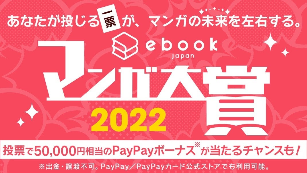 電子書籍販売サイト「ebookjapan」をヤフー株式会社と協力して運営する、株式会社イーブックイニシアティブジャパン(本社:東京都千代田区、代表取締役社長:高橋将峰(たかはしまさみね)、以下イーブックジャパン)は、第2回ebookjapanマンガ大賞を開催いたします。本賞では、ebookjapan書店員が選んだ「いま最もおすすめしたい20作品」(※1)を大賞候補作品とし、皆様からの投票によって大賞1点を決定いたします。同時に実施する投票キャンペーンでは、期間中に投票するとPayPayボーナス(※2) 50,000円相当が当たるチャンスがございます。ぜひ、好きな作品を見つけていただき、投票キャンペーンにご参加ください。