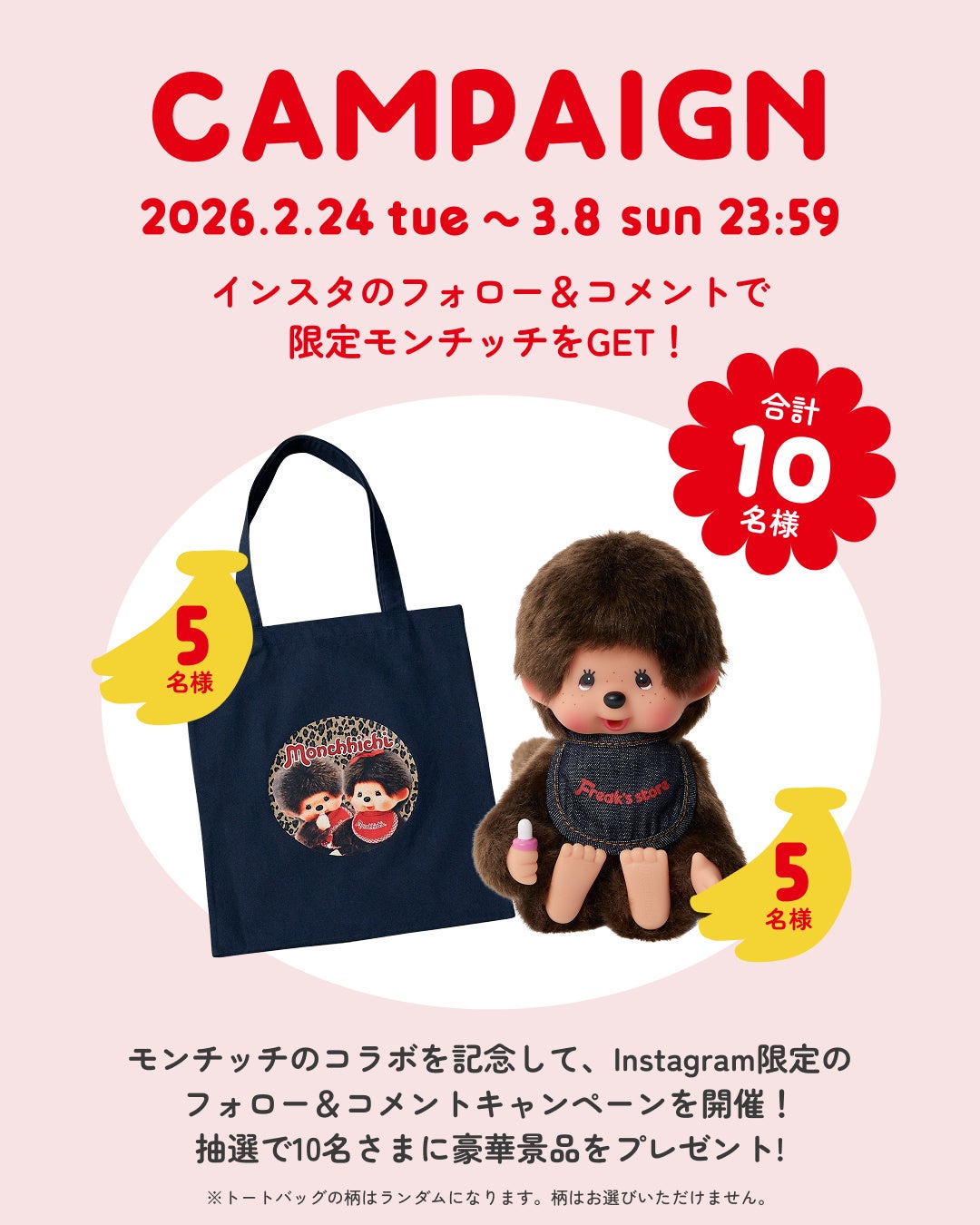 抽選で10名さまに、ここでしか手に入らないFREAK’S STOREのオリジナルスタイがついた限定モンチッチまたはPUBLUXのコラボトートバッグをプレゼント。