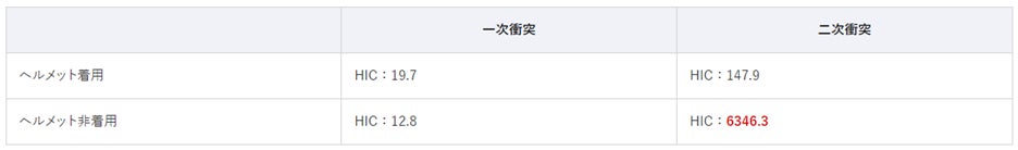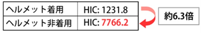 ・ヘルメット非着用時は着用時と比較し、HIC値が6.3倍にもなり、重篤な頭部損傷になるリスクや死亡するリスクが高い結果となりました。