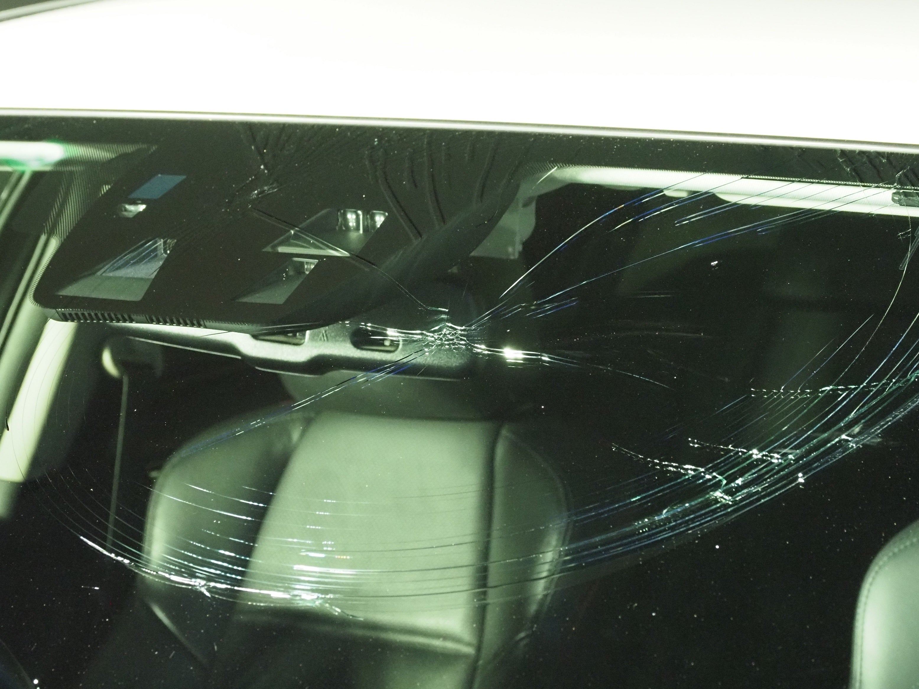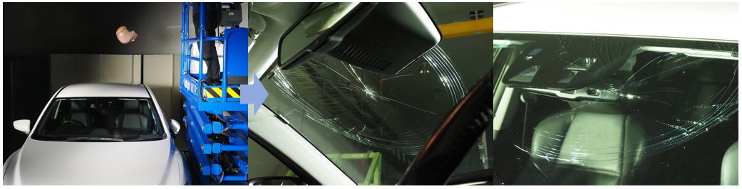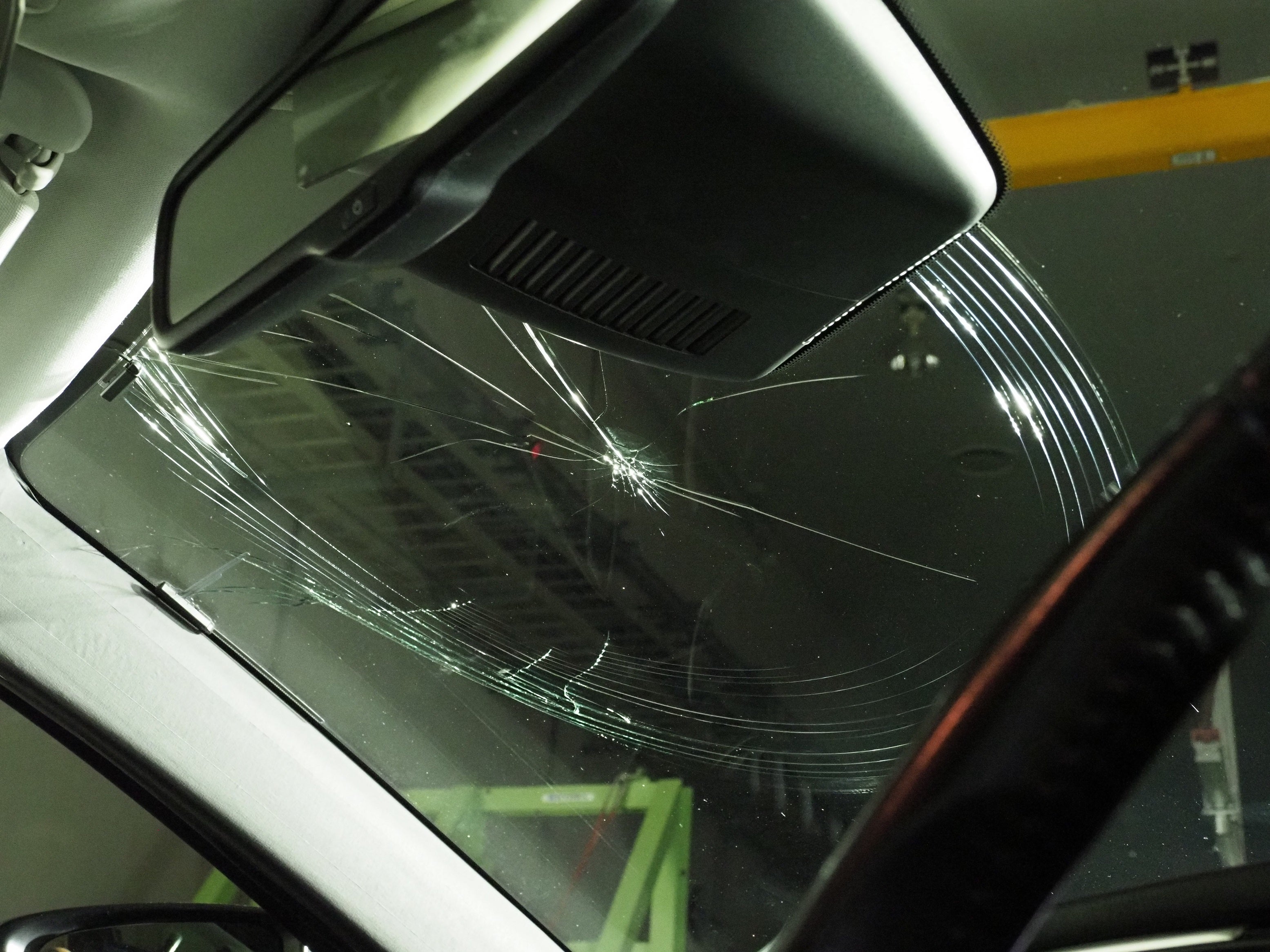 実験では電動キックボードや腕が先にぶつかっていましたが、頭部から衝突することを想定し、フロントガラスにダミー人形の頭部(4.5kg)を高さ1.6mの位置から落とし、20km/hでフロントガラスに直接頭部をぶつけた場合の衝撃を再現しました。フロントガラスがクモの巣状にヒビが広がって割れるほど衝撃は強く、頭蓋骨骨折や脳損傷、死亡のリスクが高いことが予想されます。