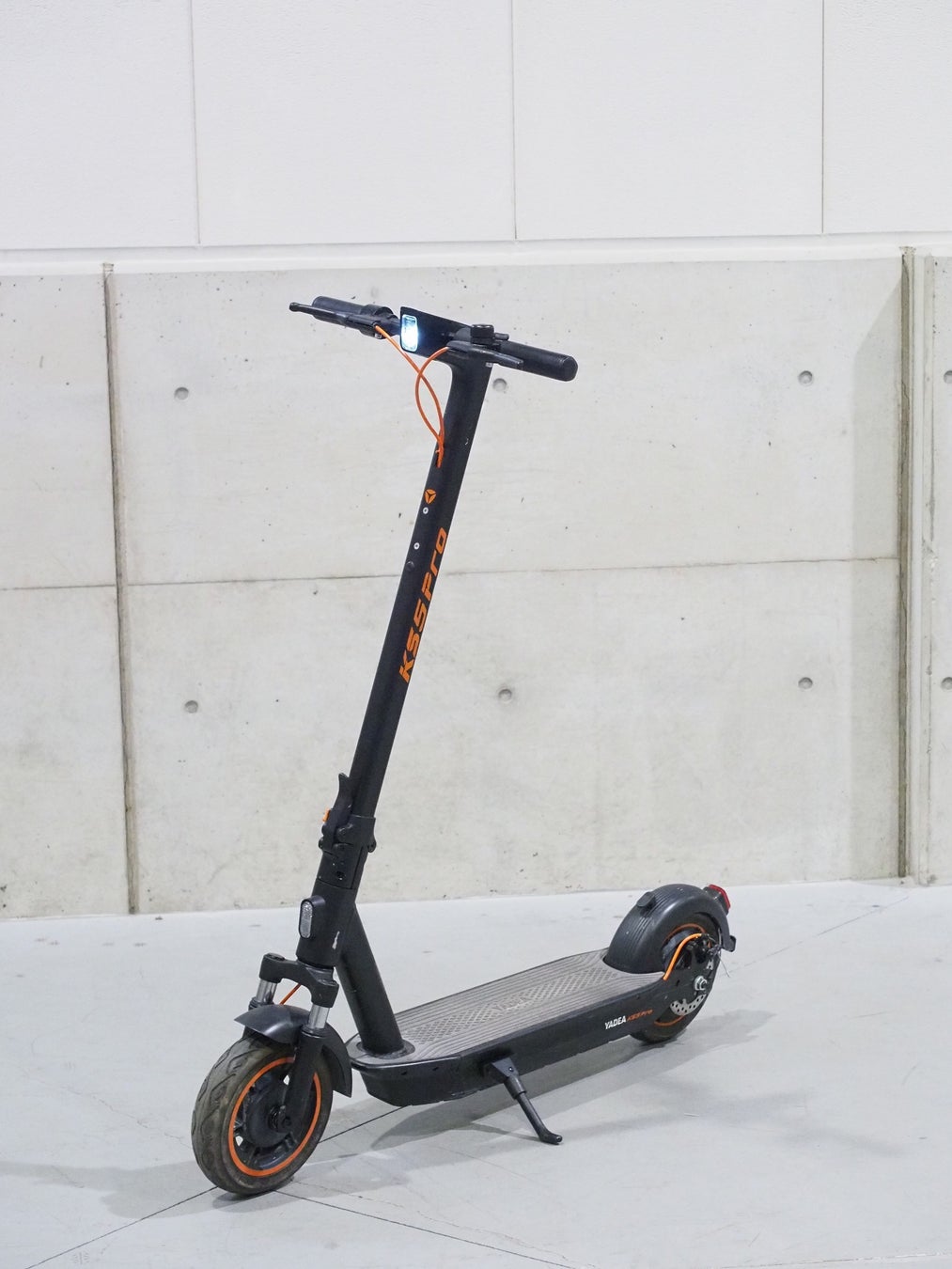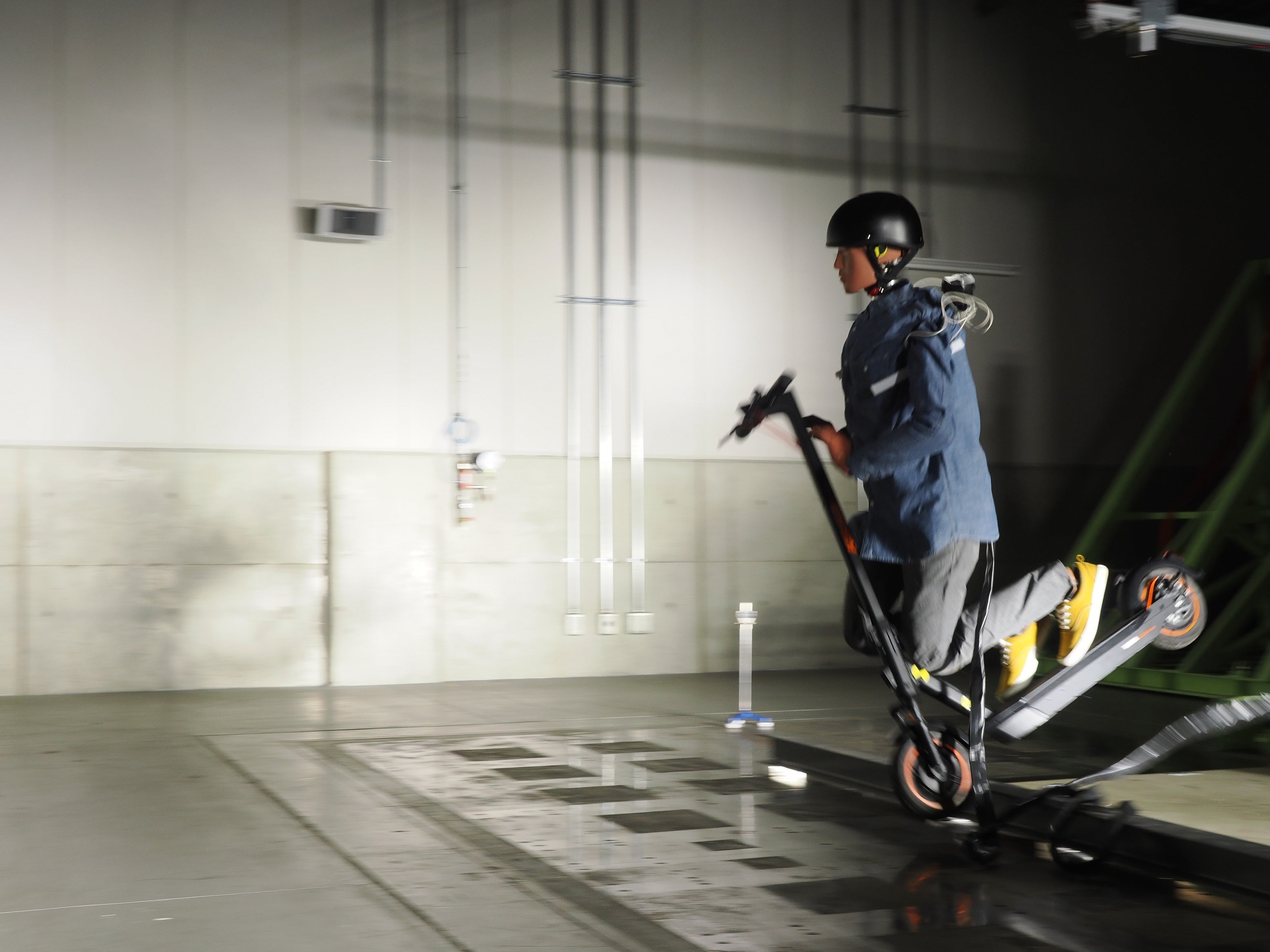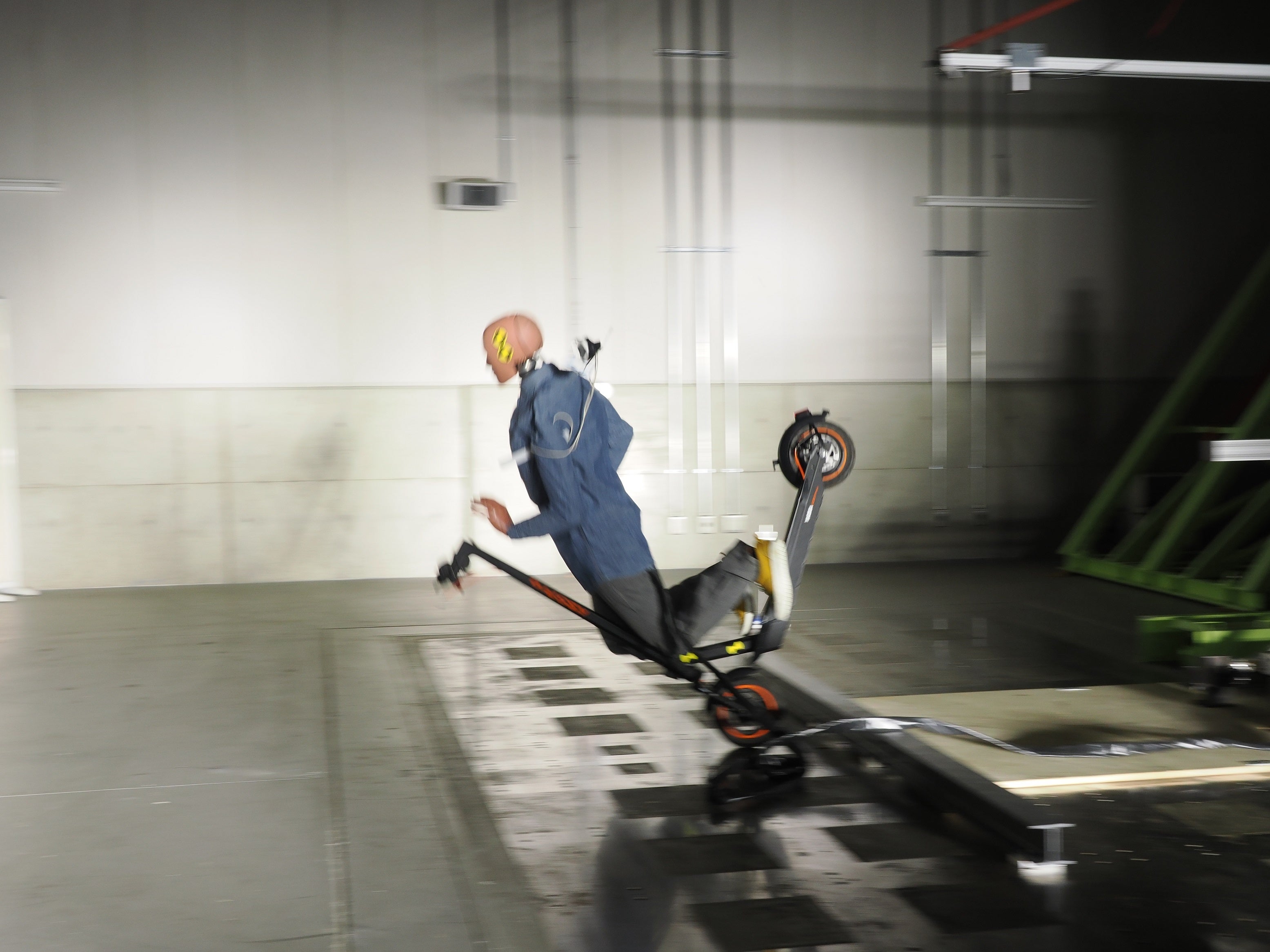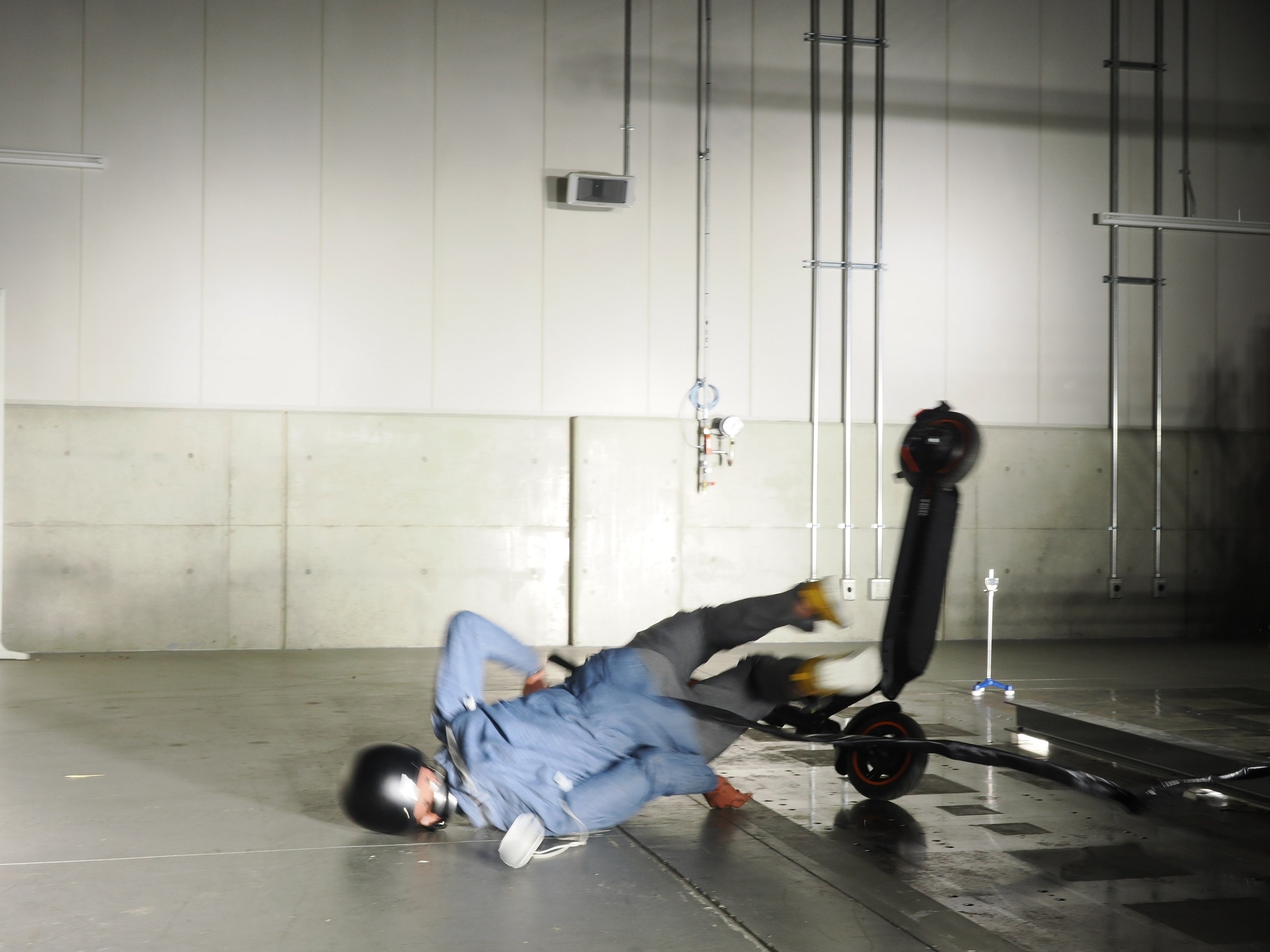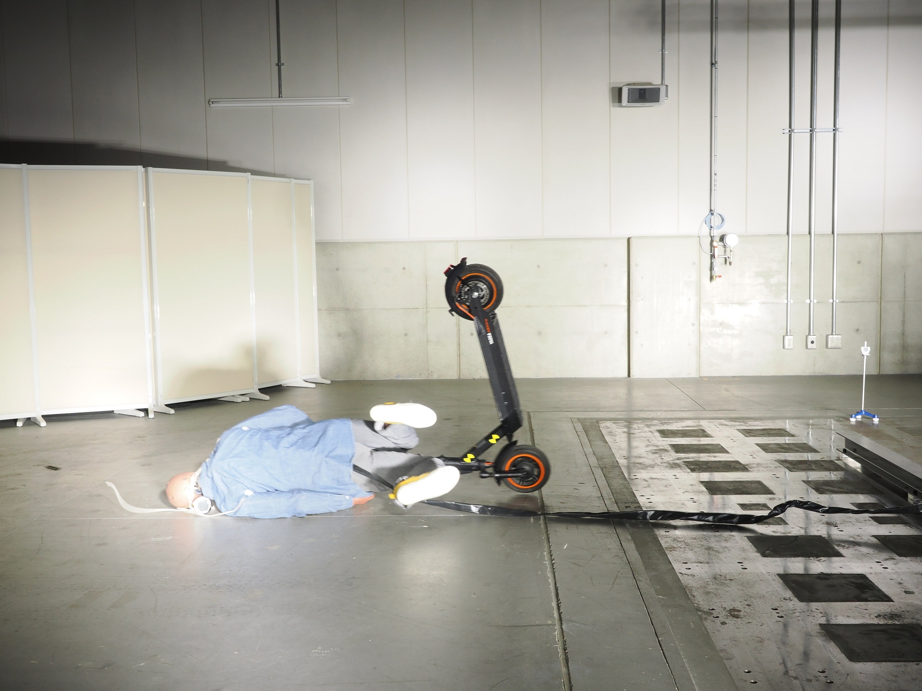 ダミー人形を乗せた電動キックボードを20km/hでけん引し、高さ10cmの縁石に衝突させ、転倒時の頭部損傷値(HIC値)を計測しました。