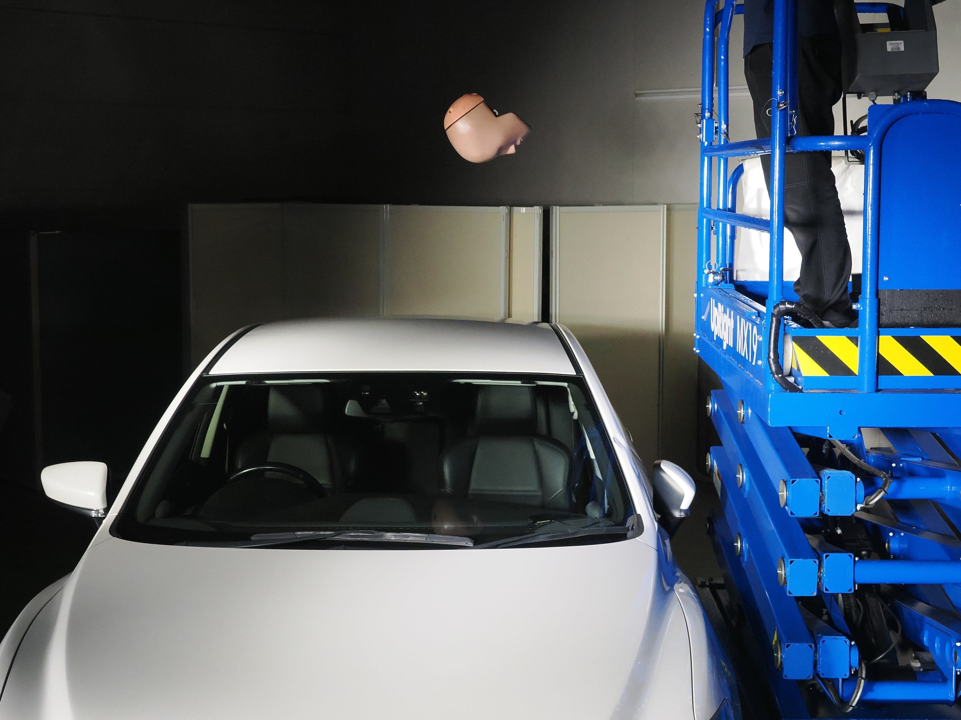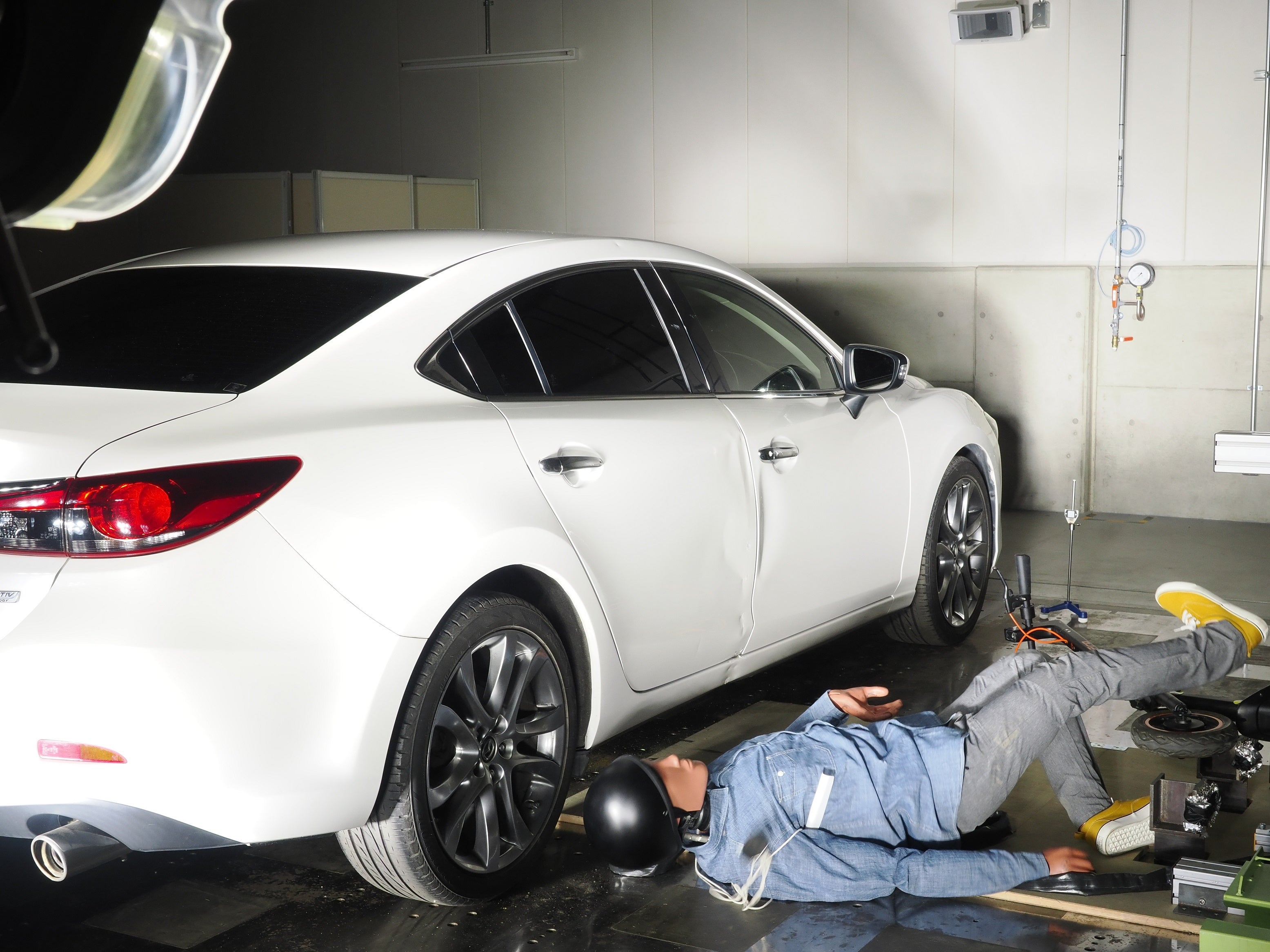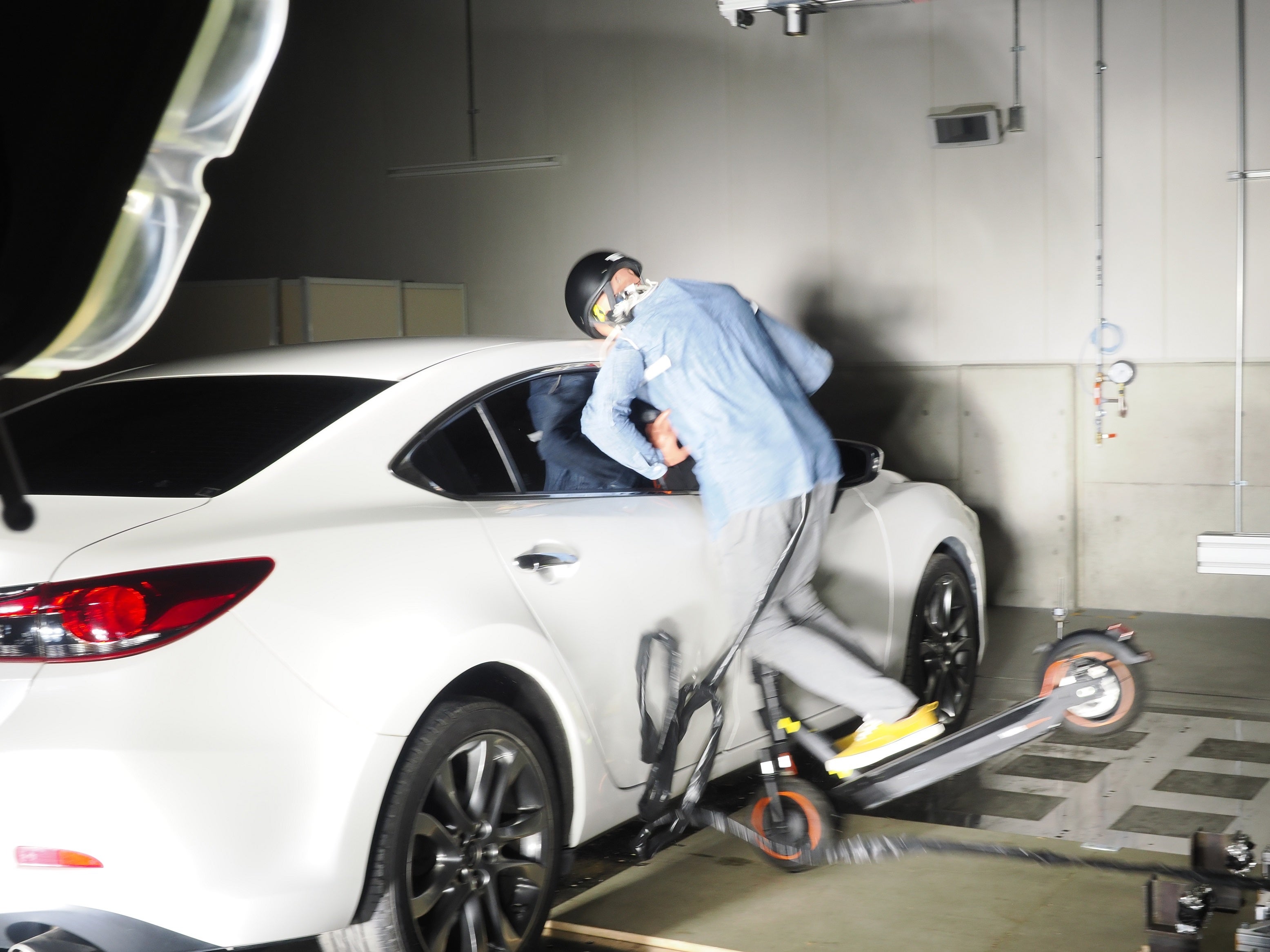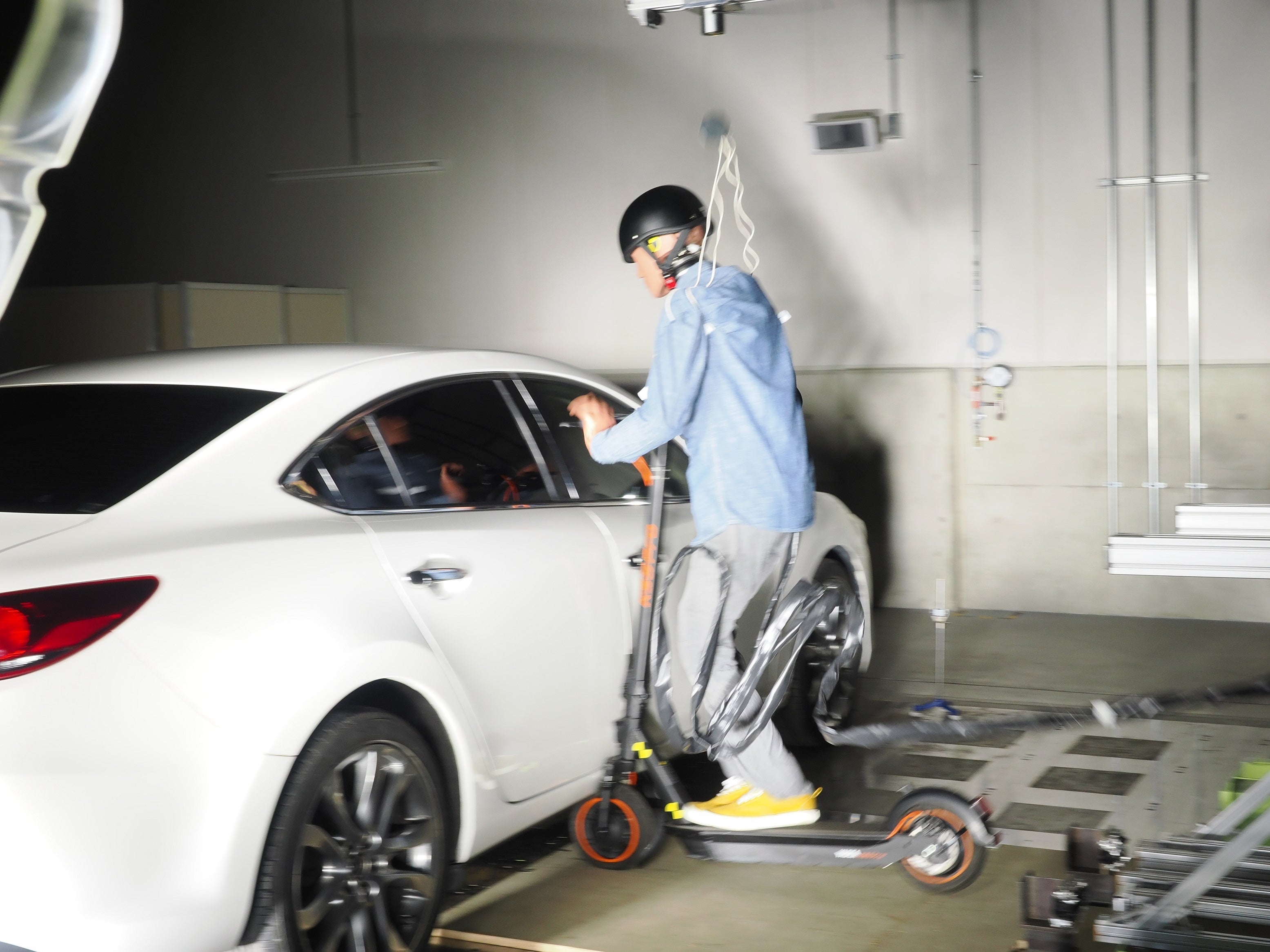 ダミー人形を乗せた電動キックボードを20km/hでけん引し、静止している自動車に衝突させました。自動車との一次衝突と二次衝突のHIC値を計測しました。