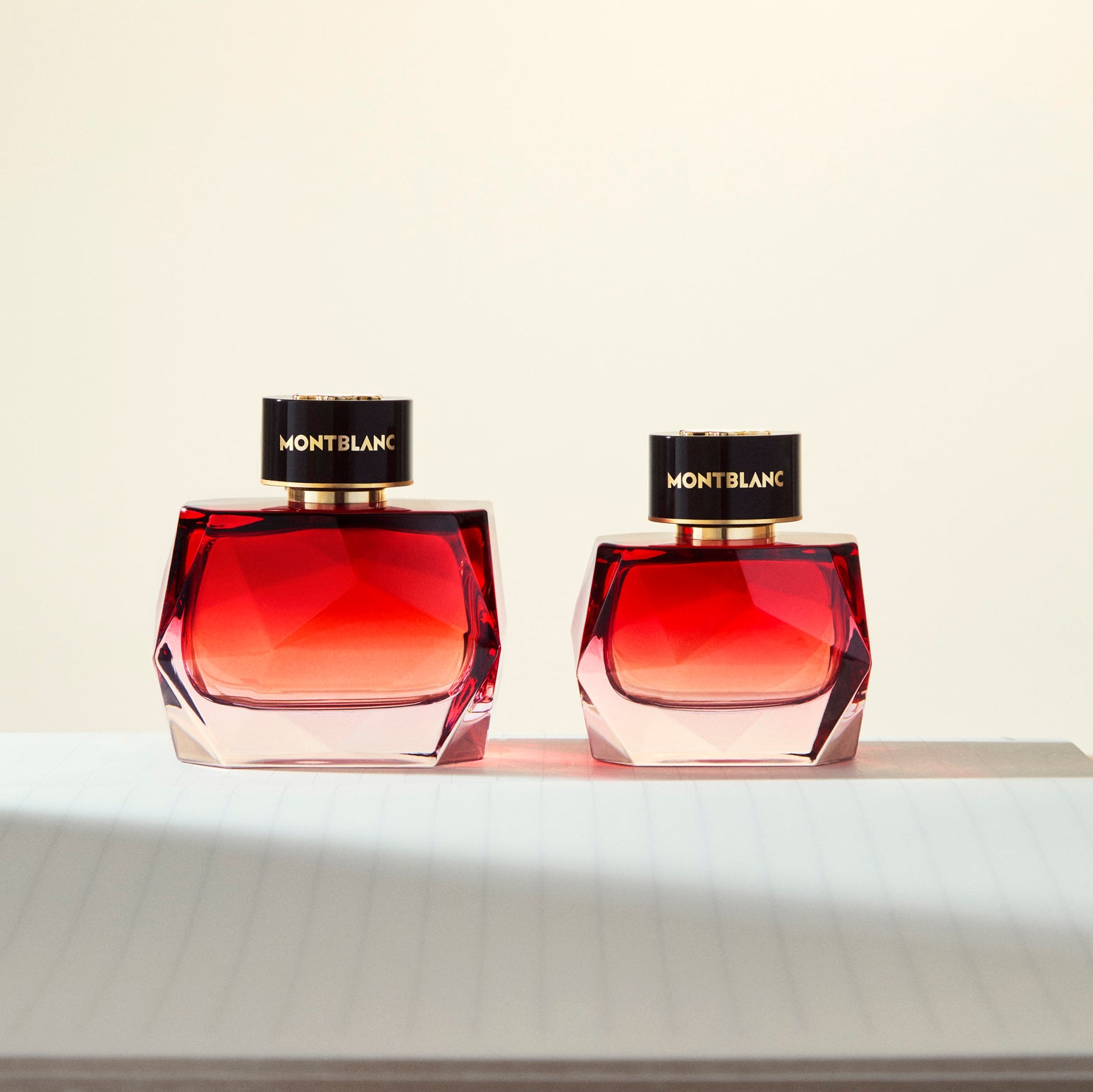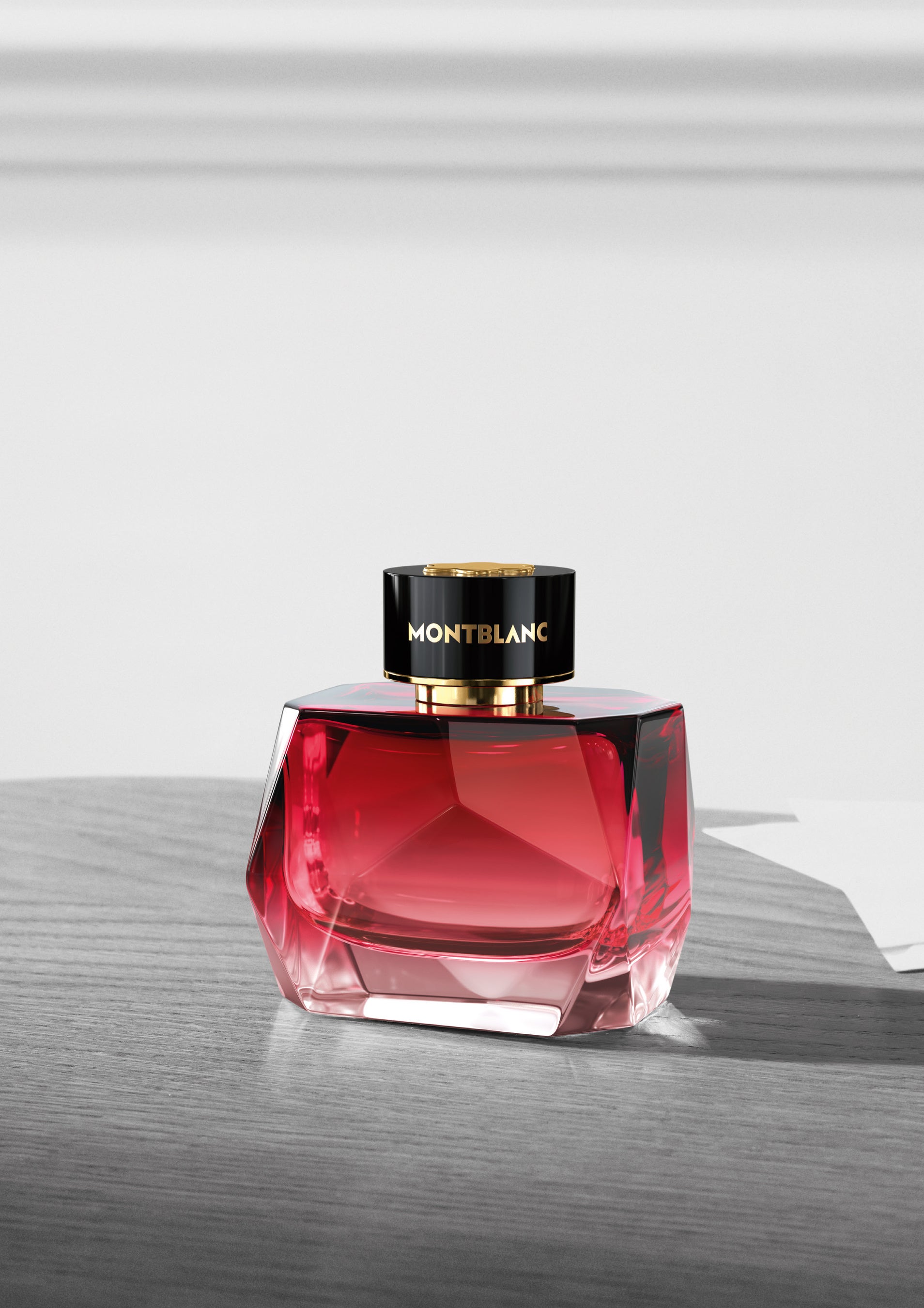 輝くようなグラデーションレッドのファセットカットのガラスボトルは、滑らかな曲線と面が光を反射し、視線を惹きつける大胆なエレガンスを体現。ゴールドであしらわれたモンブランのエンブレムを配したブラックのキャップが、このフレグランスの比類なきプレシャス感をさりげなく際立たせます。外箱には、モンブランの豊かなヘリテージを想起させるマットブラックのサフィアーノパターンを採用。レザー クラフツマンシップにおけるメゾンのサヴォアフェールを表現し、ゴールドのバンドと手書き風ロゴが、洗練された仕上がりを完成させています。