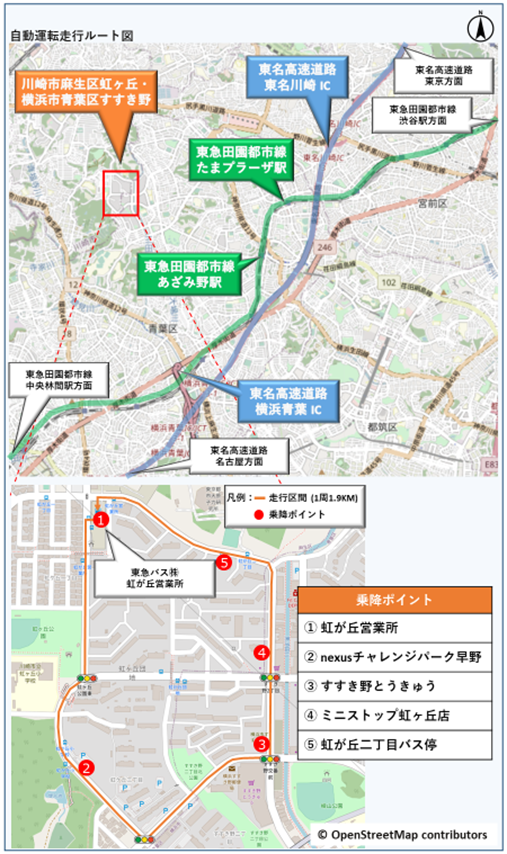 なお、本実験にあわせ、東急および企業、行政、教育機関が連携して運営する新たなまちづくりの拠点 「nexusチャレンジパーク早野」でイベントを開催します。自動運転車両の乗降ポイントに「nexusチャレンジパーク早野」を設定し運行することで、多くの方に本実験に参加いただき、移動に関する課題・ニーズの検証を広く実施します。
