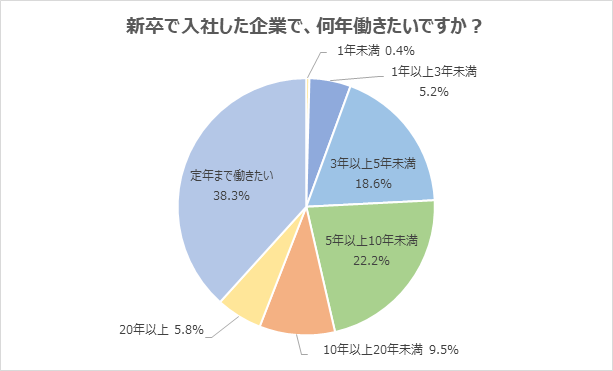 (1) 新卒で入社した企業で「定年まで働きたい」と回答した学生が4割に迫る。「3年未満」の回答は5.6%に留まる