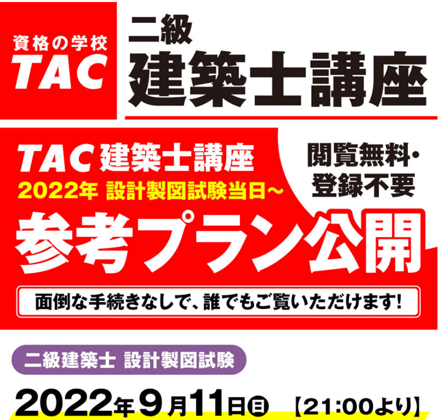 資格の学校TACでは、9/11(日)に実施される「令和四年 二級建築士 設計製図試験」に基づき、その参考答案プランを試験当日の21:00頃より、TACホームページで公開いたします。