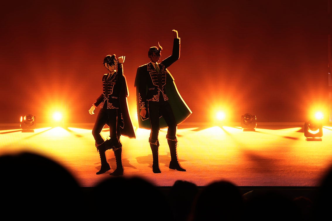 ソロパートの先陣を切ったのは、獣人のシエンによる「脱法ロック」。アップテンポなロックサウンドと本家MVを思わせるコミカルなダンス、ときに3人や5人に増える映像演出も相まってお祭り気分を盛り上げると、同期に後を託した。最初シルエットで登場した魔人・オウガは、紗幕が上がると、身長ほどもある大きな鎌を持って登場。「絶望ビリ―」で初披露のデスボイスを轟かせ、ド迫力のパフォーマンスはさながらゲームのラスボス戦のようだ。それぞれに激しいカバー曲で湧かせた2人は、3期生ユニット曲「ナイト ライト サイド」を歌唱。互いに背中を預けて歌う仕草や、「ずっと君を探してた」「さあ、おいで」というセリフをまじえながら、「魔フィア」によるステージを大成功させた。