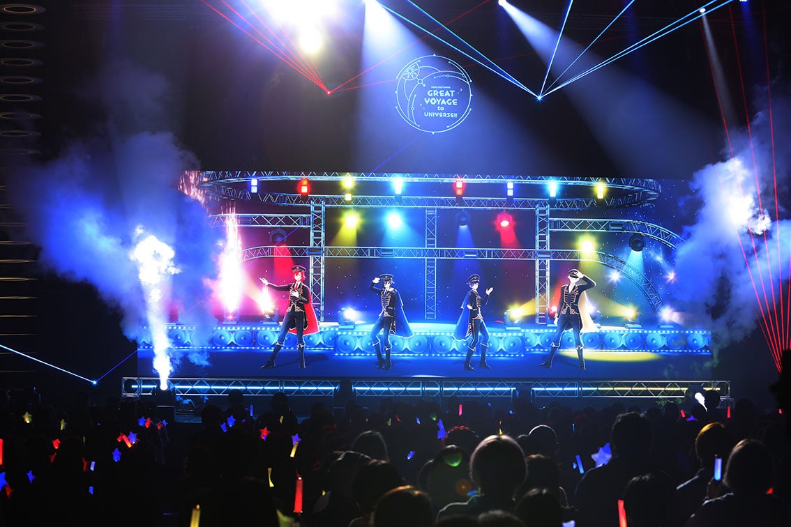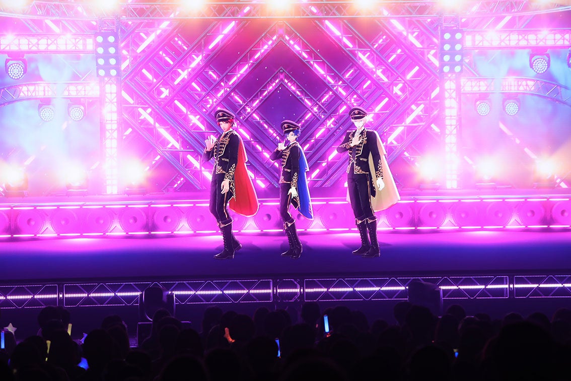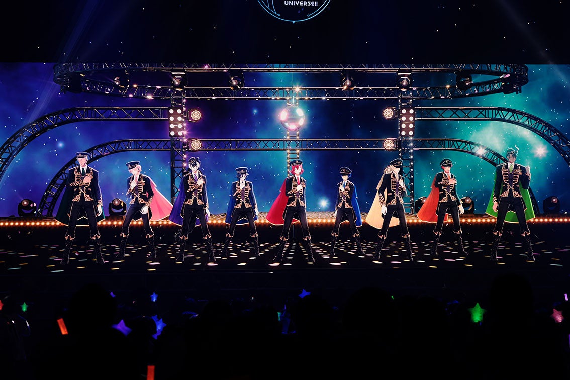 出航を祝うオープニング曲は、「JOURNEY to FIND STARS」。前回の1stActで本編の最後に歌われたこの曲が、今回へとバトンをつなぎ、1曲目で披露された形だ。9人全員が黒を基調としたステージ衣装に身を包み、各色のマントをなびかせながらパフォーマンスする様子は壮観としか言いようがない。特筆すべきはステージの奥行き感で、左右だけでなく前後の距離感も使ったフォーメーションで、立体感・臨場感を演出。間奏がライブ仕様の長尺にアレンジされている間、一人ずつ思い思いのメッセージを語ると、全員で開演を高らかに宣言した。