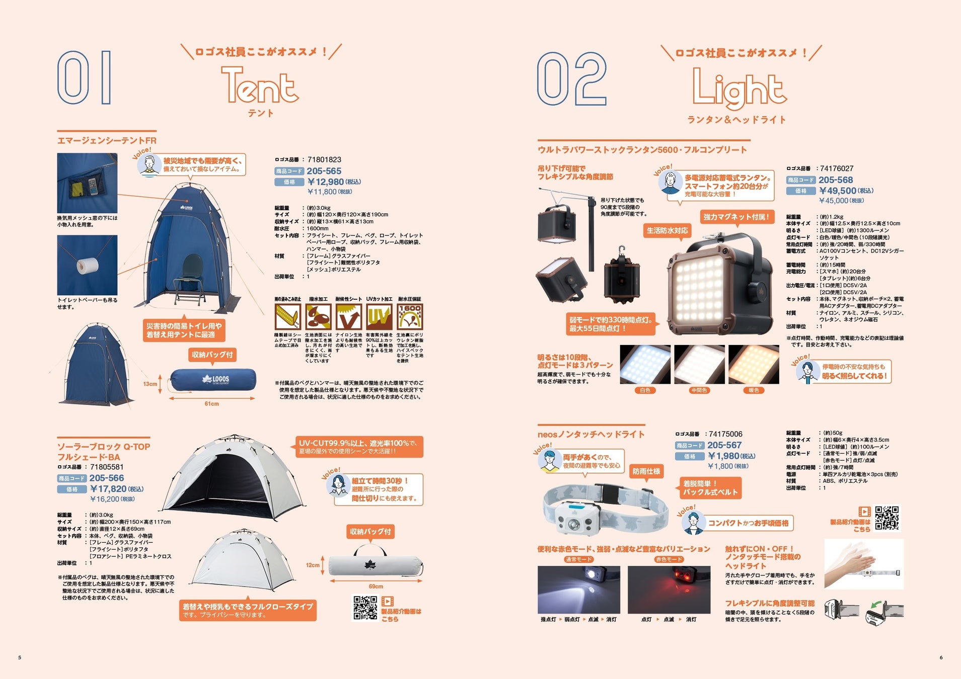 本冊子ではロゴス社員が推薦する商品を災害時にも役立つポイントと併せてご紹介し、アウトドアグッズを取り入れることで、災害時においても「快適に過ごす」ことができる方法をお伝えいたします。