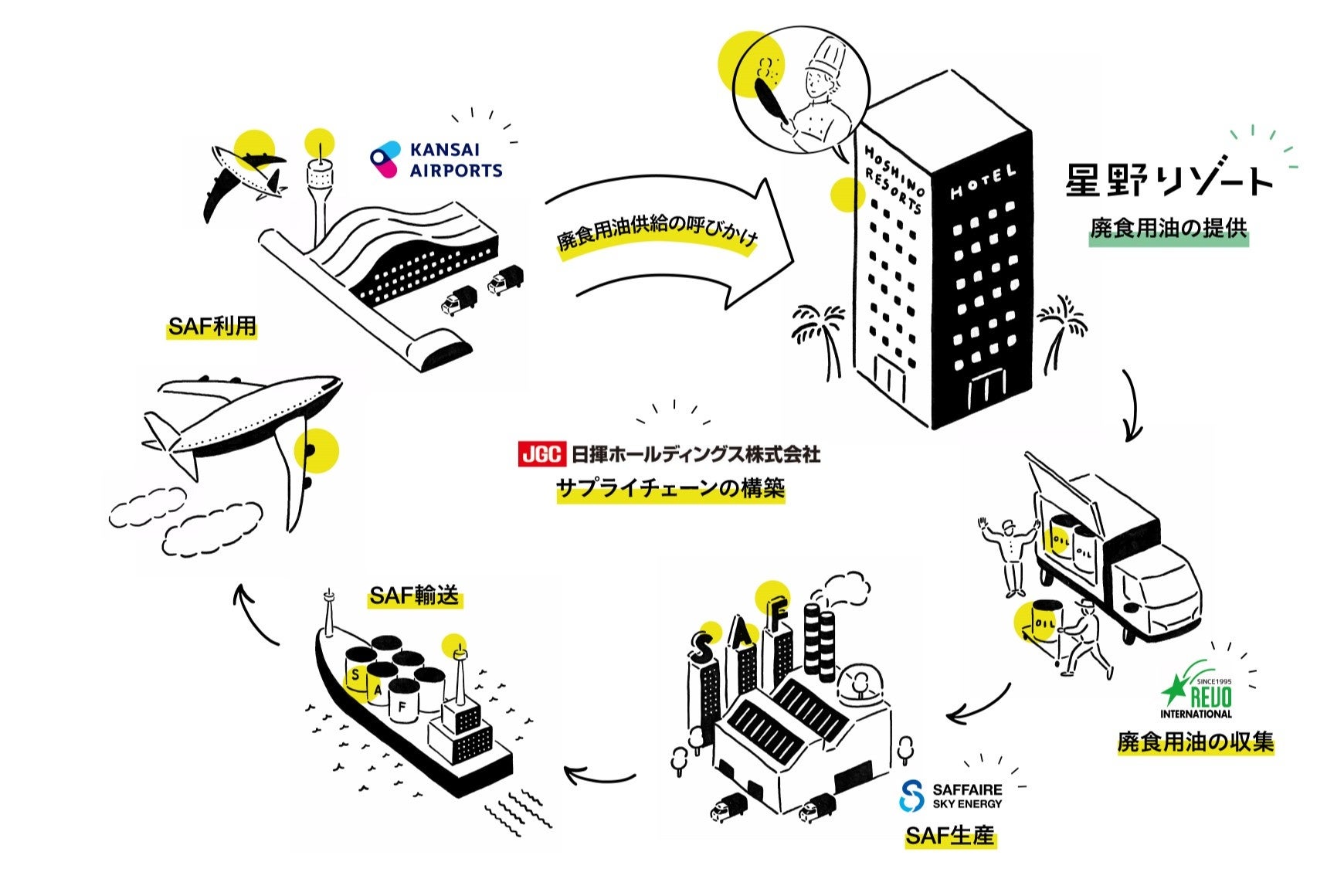 2022年、日揮ホールディングス、レボインターナショナル及びSAFFAIRE SKY ENERGYと、「国産SAFの量産化に向けた協力に関する基本合意書」を締結。2025年の国産SAF大規模製造第1号の実現、SAFの地産地消をめざし、SAFの重要性を周知し、空港や地元の飲食店・ホテル・学校・地域住民などに廃食用油の回収を呼びかけるなどの取り組みを行っています。この呼びかけを受けて、「OMO関西空港 by 星野リゾート」を含めた本取り組みの実現に至りました。