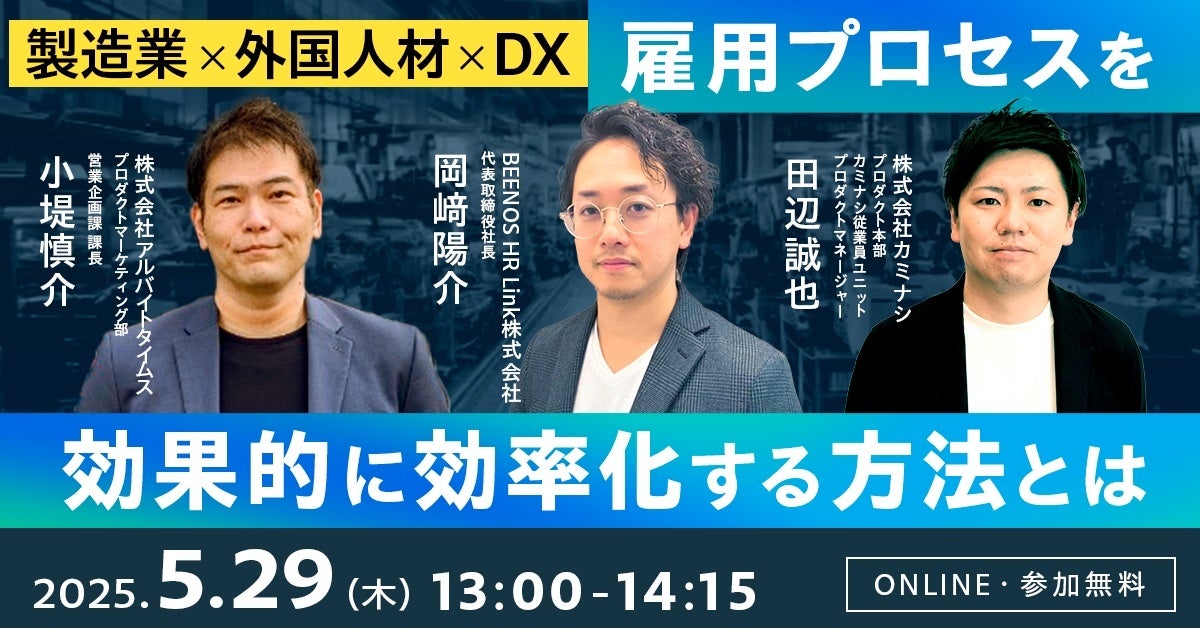 BEENOS株式会社(東証プライム:3328)の連結子会社で、特定技能雇用を包括支援するBEENOS HR Link株式会社(以下「BEENOS HR Link」)は現場DXプラットフォーム『カミナシ』シリーズを提供する株式会社カミナシ(本社:東京都千代田区、代表取締役:諸岡 裕人、以下「カミナシ」)、求人情報事業等を展開する株式会社アルバイトタイムス(本社:東京都中央区、代表取締役:堀田欣弘、以下アルバイトタイムス)と共同で、2025年5月29日(木)13:00からウェビナー「【製造業×外国人材×DX】雇用プロセスを効果的に効率化する方法とは」を開催いたします。(参加費無料・事前登録制)
