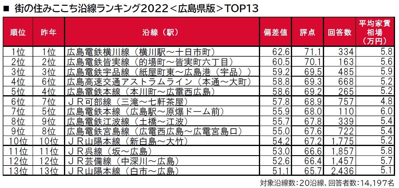 1位は広島電鉄横川線(横川駅~十日市町)、2位は、広島電鉄皆実線(的場町~皆実町六丁目)、3位は、広島電鉄宇品線(紙屋町東~広島港(宇品))で、1位~3位は、2年連続昨年と全く同じ結果で、引き続き広島市中心部へのアクセスが良い沿線が評価されています。